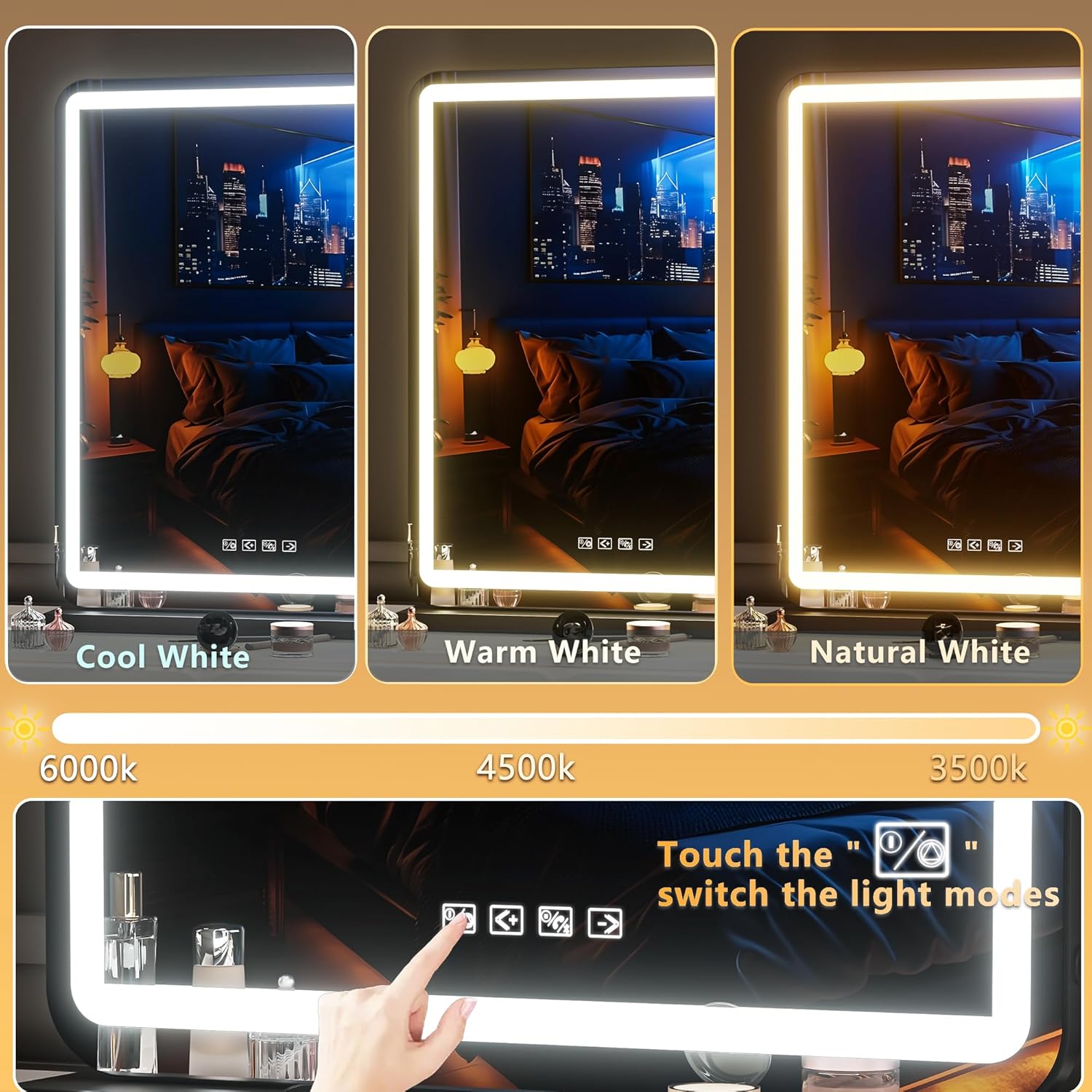 • 👍【Smart Touch Control & Memory Function】This makeup mirror with lights has 3 smart touch buttons, turn on/off the light by touching the sensor switch, Press left button to change the color modes, long press right button to adjust the led brightness. This lighted makeup mirror is specially designed memory functionfunction keep your lights setting like your last use.