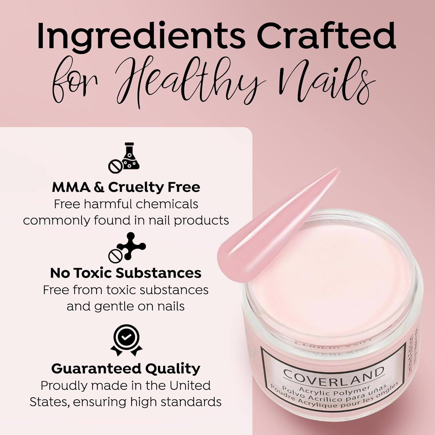 • βœ”οΈππ‘πŽπ…π„π’π’πˆπŽππ€π‹ 𝐆𝐑𝐀𝐃𝐄: The flexibility and adhesion properties of Coverland colored acrylic nail powder make it easy to shape nails with precision, and offers nice control for professionals who prefer to work with a polymerization rate of moderate to fast.