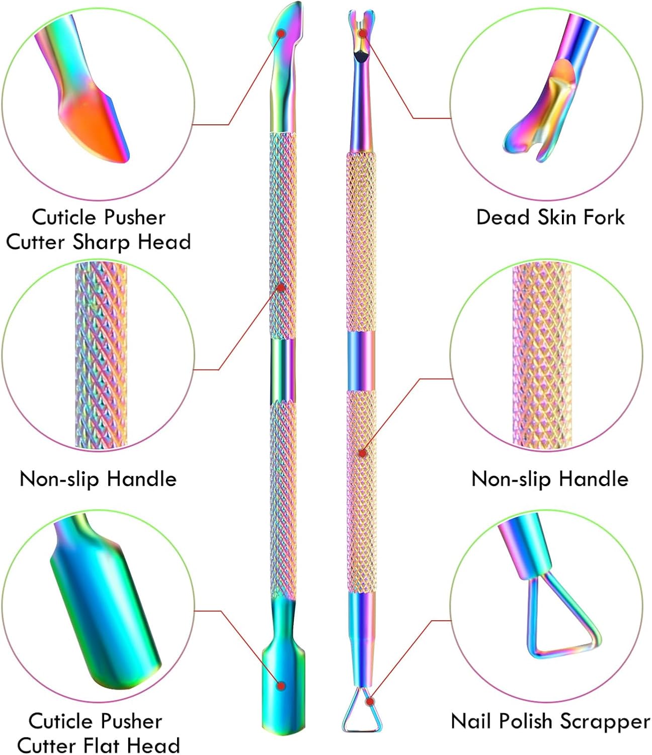 • Ergonomic Non-slip Handle Design -- Our professional cuticle remover tools set is designed with an ergonomic non-slip handle, providing you with a comfortable hand feeling, you can remover the cuticles more effectively. In addition, the chameleon design makes it a beautiful set of color manicure artwork.