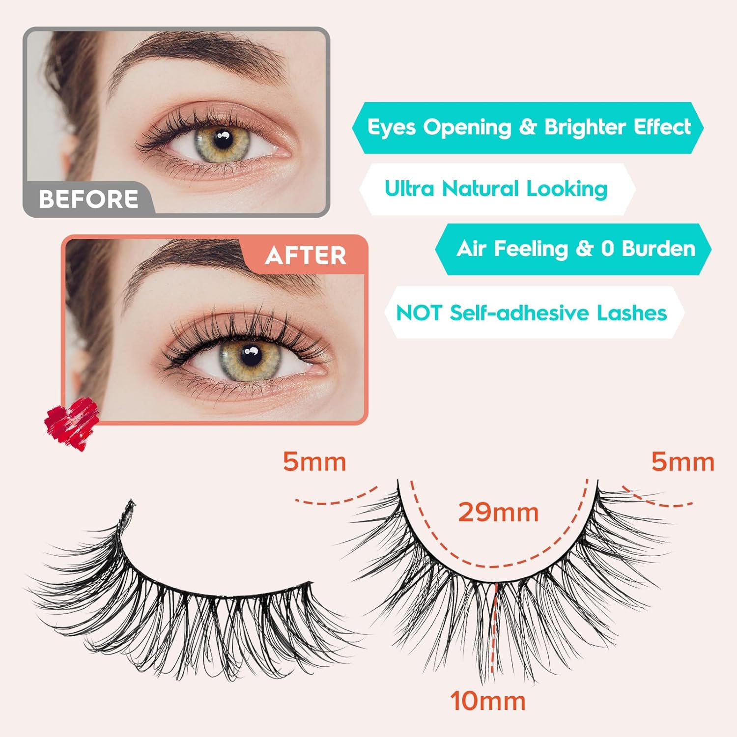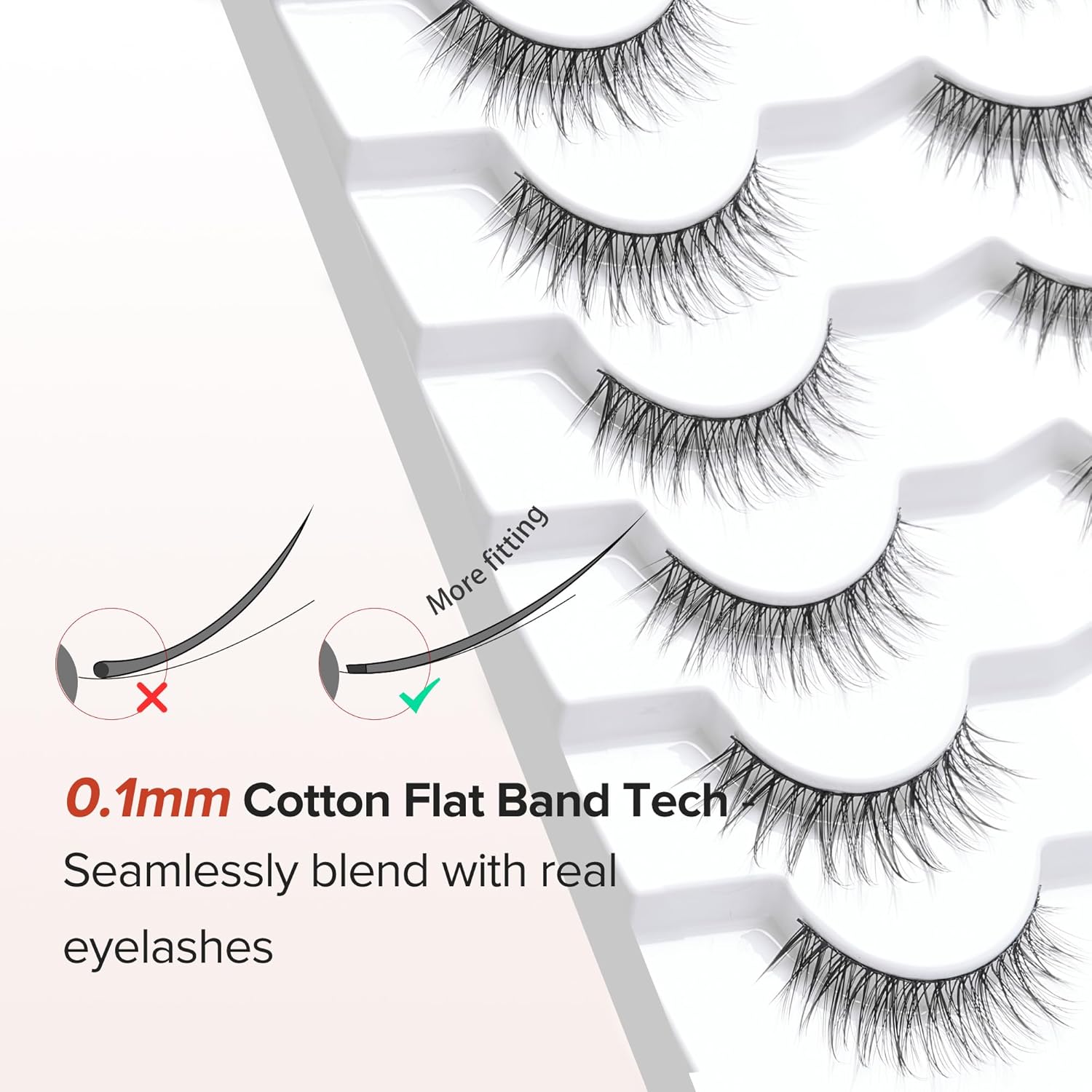 • THIN BAND FALSE EYELASHES: The wispy eyelashes use 0.1mm thin cotton flat band tech, seamlessly blend to your real eye lashes. Incredibly flexible, easy to bend and stay well on, beginner friendly