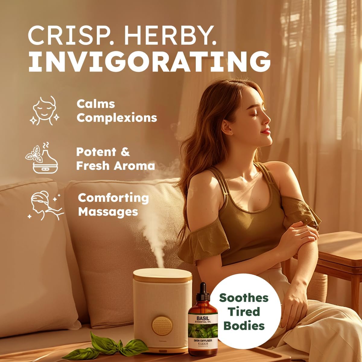 • Basil essential oil for diffuser. Create a soothing and relaxing atmosphere as you wind down and chill with the scent of fresh basil. Diffuse 2-3 drops of basil oil to an essential oil diffuser for 30 minutes to refresh and enliven your home.