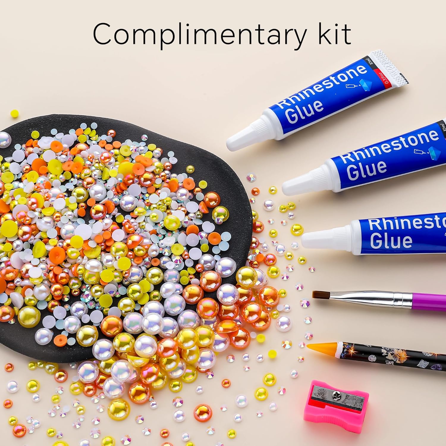 60g Orange Citrine Pearls Rhinestones for Crafts Mixed Size 3mm-10mm AB Color Round Half Pearls Flatback Pearl Beads and Resin Rhinestones Set for Face Art with Glue