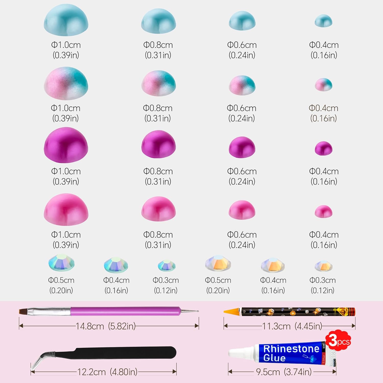• Assortment Sizes: The flatback half pearls come in a mixture of colors and sizes of 3/4/5/6/8/10mm. The flatback rhinestones are resin rhinestones in sizes of 2/3/4/5/6mm. These mixes are such a great way to get an assortment of colors and sizes without having to buy each item individually