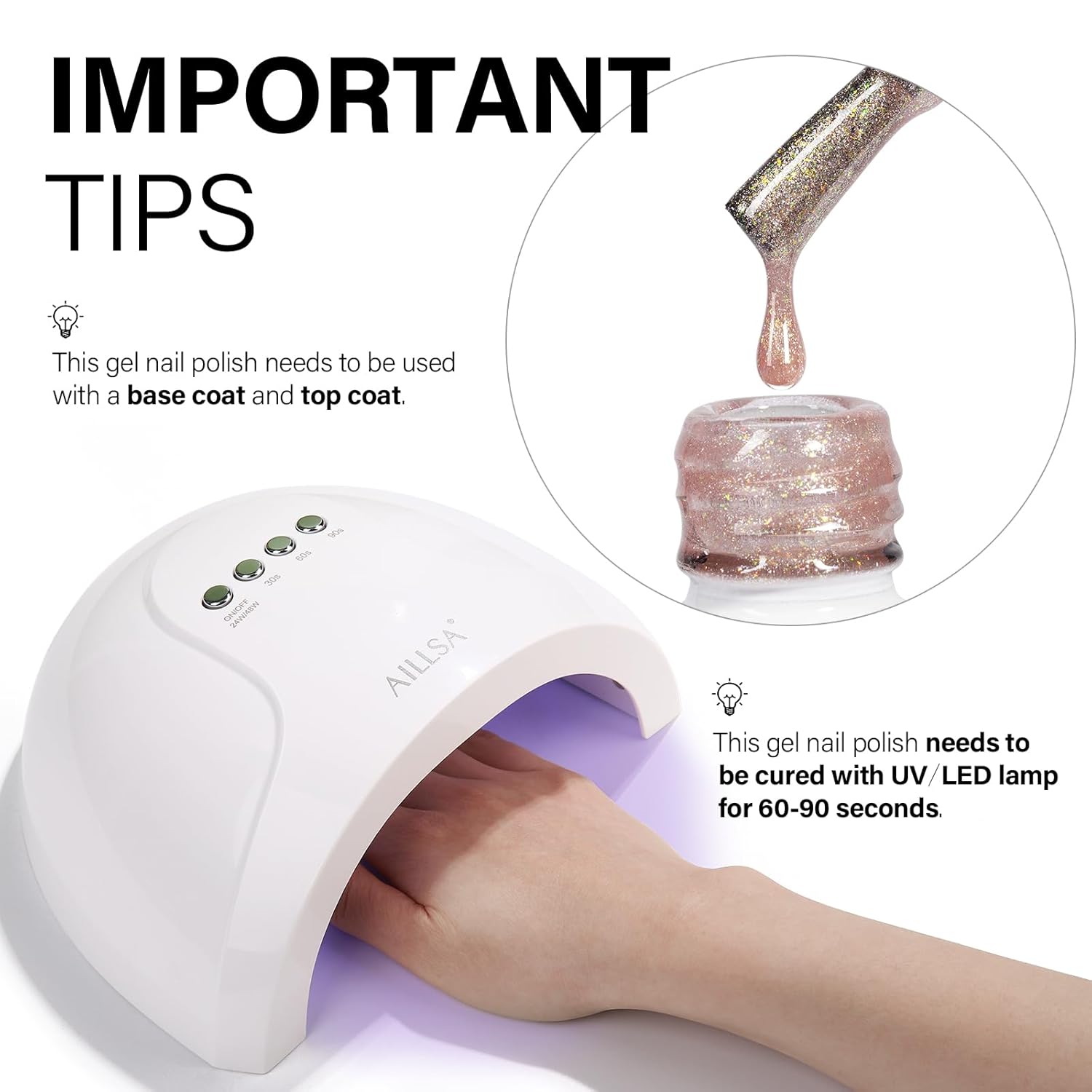 • LONG-LASTING SHINE - AILLSA champagne gold gel nail polish needs to be cured under U V lamp, under the correct use steps, it can last for 21-28 days and keep the shiny luster. You'll never have to worry about your nails peeling off while showering and doing housework. Let AILLSA serve you a longer time!