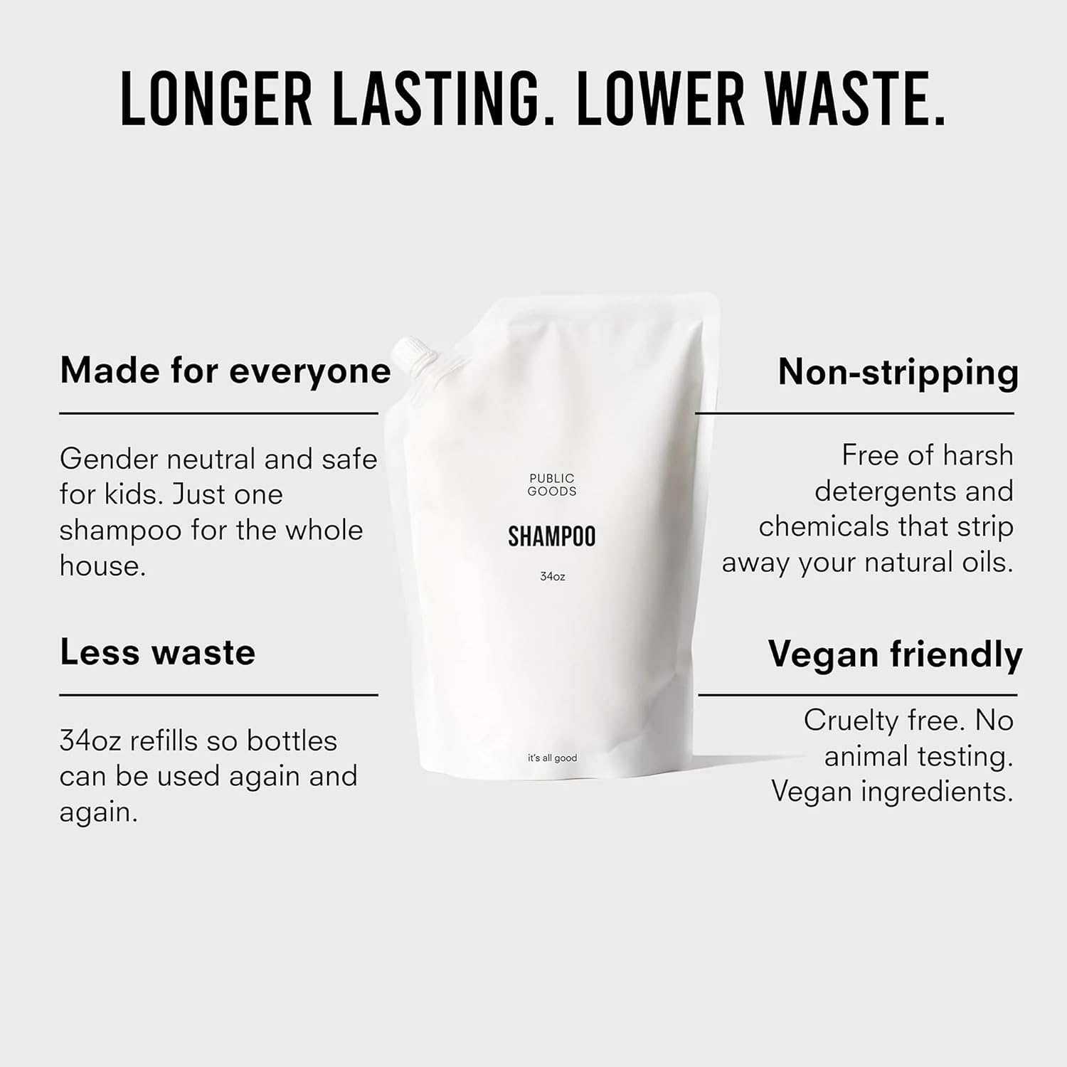 • Less Waste - Designed with sustainability in mind, our 34 ounce shampoo is ideal for refilling our 12 ounce bottle or one of your own.