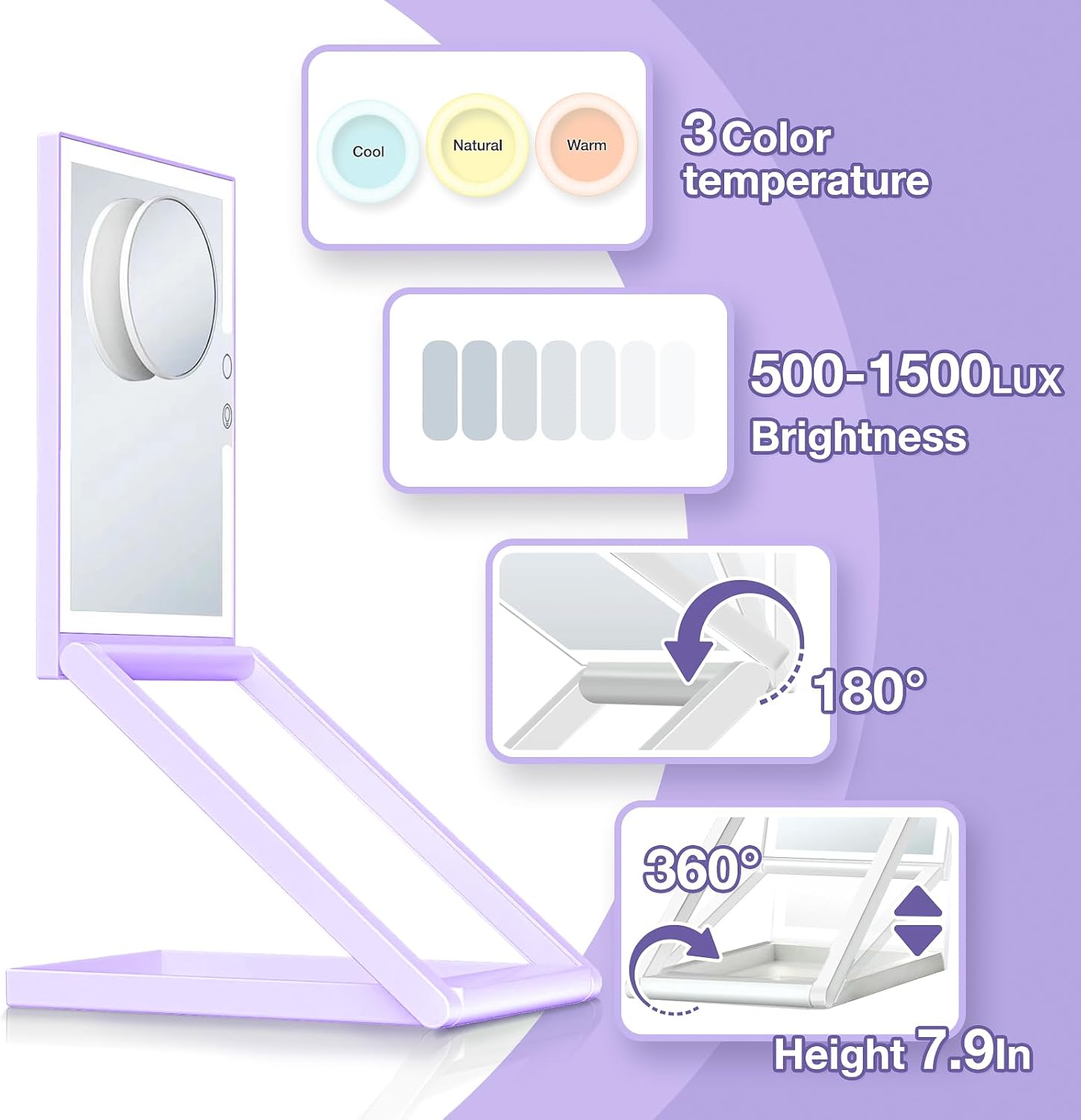 • TRAVEL MAKEUP MIRROR WITH 3 COLORS LIGHTING:Simply touch the screen can turn on/off the lights, our portable mirror with lights offers 3 delicate light colors (cool, natural and warm) with each adjustable brightness color mode for you to catch every exquisite makeup moment.