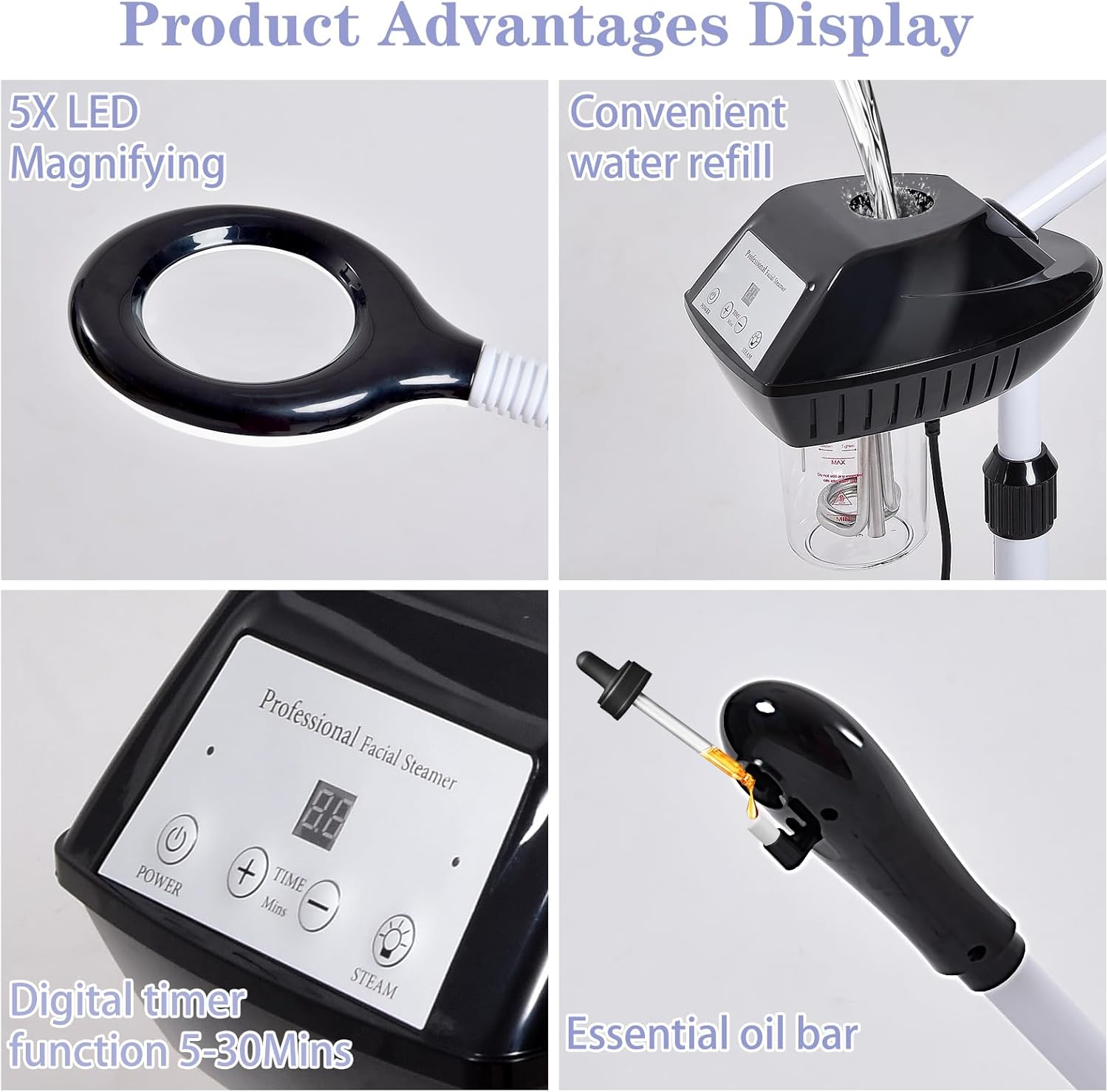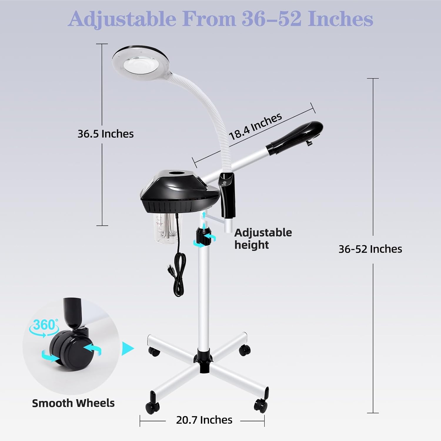 • 【Facial Steamer Professional】The facial steamer comes with an upgraded atomizing cartridge, removable 500 ML water cup, 36-52 inch adjustable height, 360° rotating nozzle, and 360° rotating body.