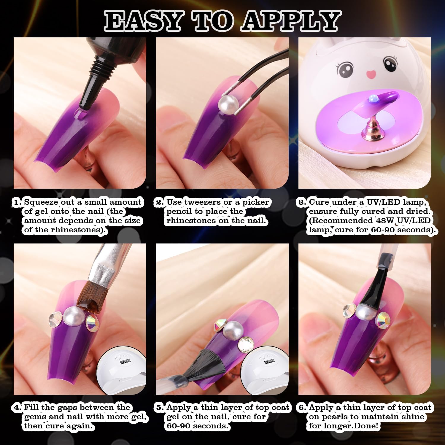 • 💎ADHESIVE GEL GLUE -- The crystal clear nail gem glue uses a special, non-toxic and eco-friendly formula with strong tackiness, adhesion, and fluidity for easily applying decorations. It is a type of UV gel glue. After proper curing under a UV/LED lamp, the glue dries clear with superior bonding strength that can last weeks without falling off. With the designed tip, you can easily and conveniently apply the glue to the nail bed or the surface of false nails.
