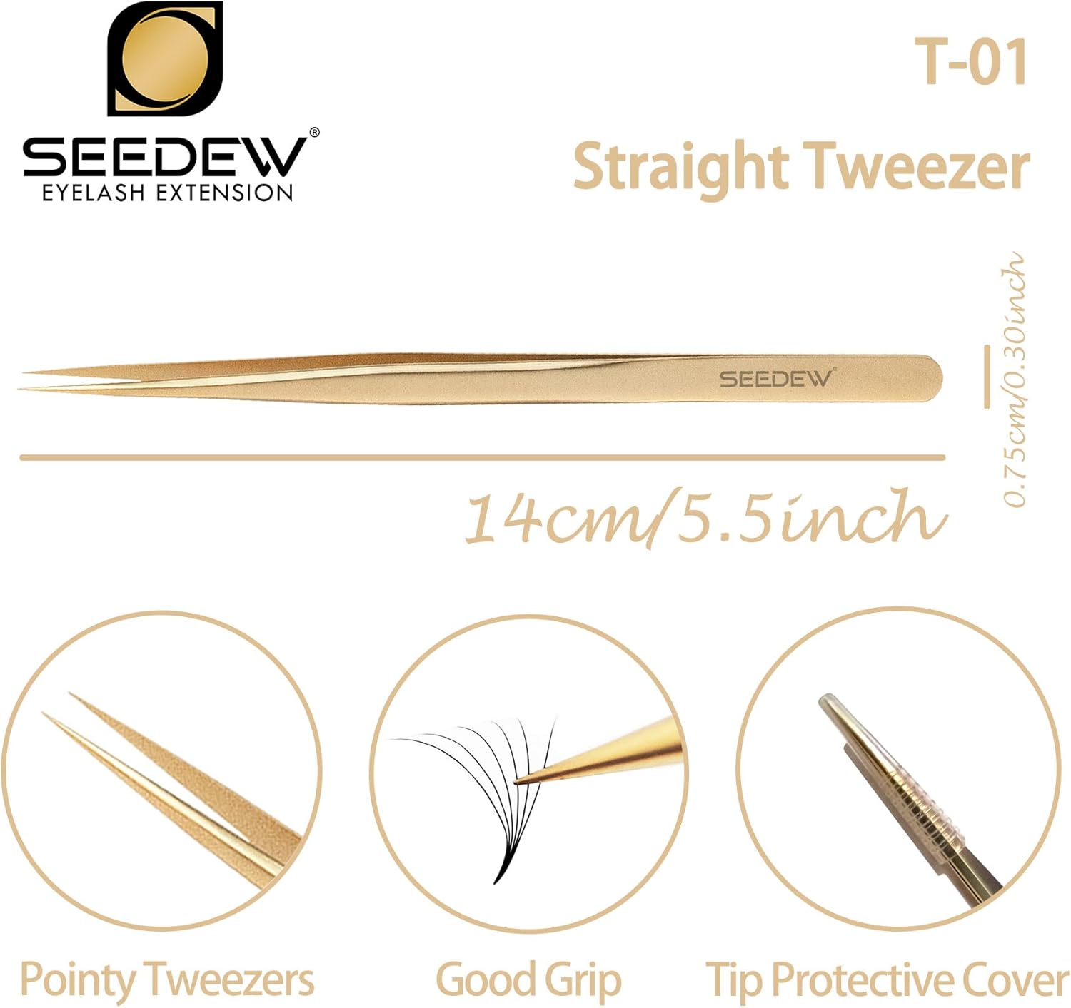 • ⭐【Premium And Classic】SEEDEW stainless steel golden tweezers have texture, smooth surface, classic and elegant style. 1 piece tweezer is equipped with a cover for the tip of the tweezer and a protective case, which is safe for storage, dustproof, dropproof, and imitation of poking.
