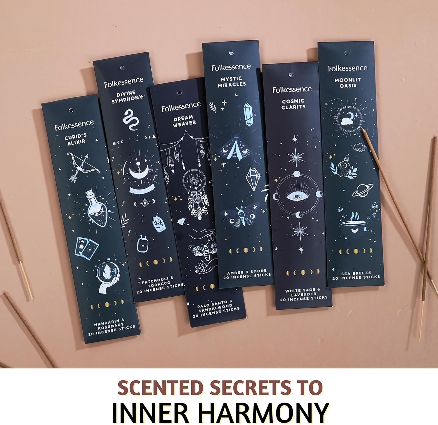 • Fragrance Notes – This incense pack combines uplifting citrus notes with breezy oceanic undertones with fragrances like palo santo incense, cedarwood incense, amber & smoke, white sage incense & lavender incense, mandarin incense, rosemary incense, patchouli incense & sea breeze. Suitable for meditation rooms, bedrooms, living areas, and even office spaces.