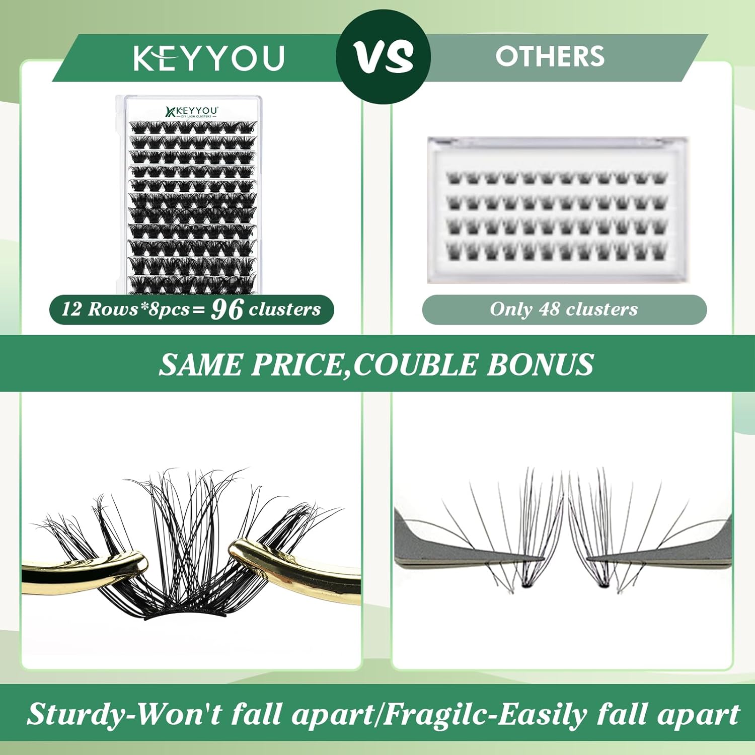 • 【Soft&Comfortable】KEYYOU lash cluster are made of imported materials,the stem line is thinner and softer, the eyelash cluster are lighter and more comfortable to wear.96 clusters in one tray ,more cost-effective.