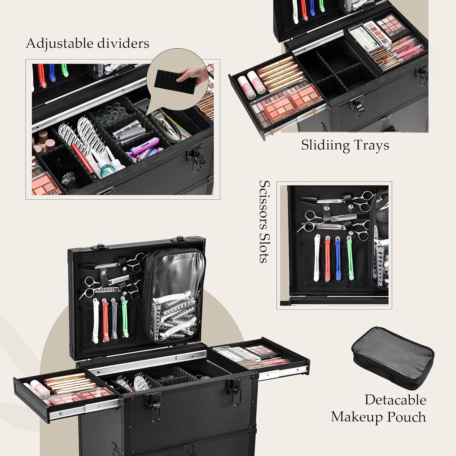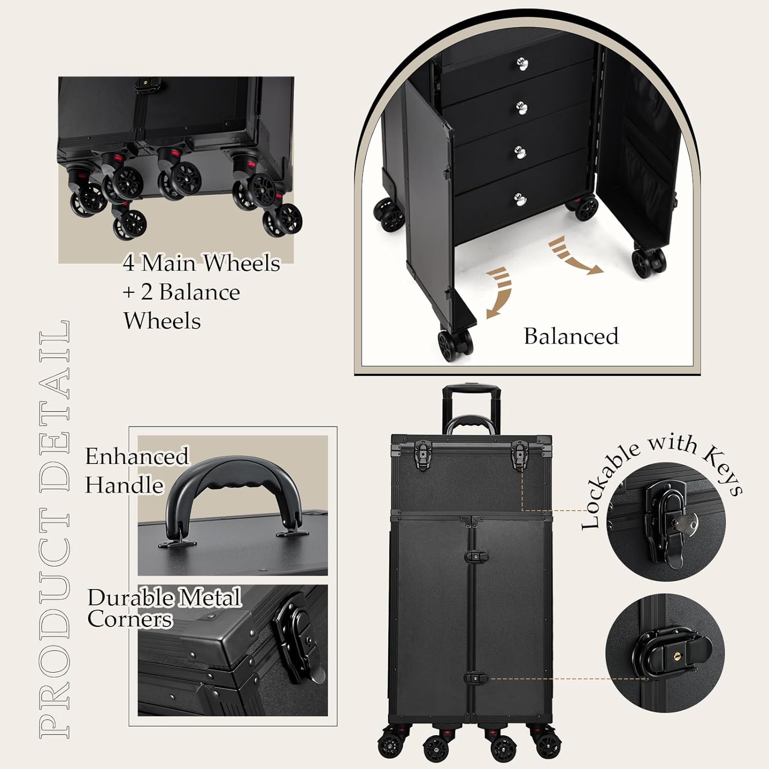 • Convertible Makeup Station: This makeup rolling case is a Convertible Makeup Station, the ultimate answer to your cosmetic needs. With 2 sliding flat trays for a temporary worktop, 4 large drawers set transformed into shelves, and 2 side doors providing steady balance, this makeup case is your versatile solution for seamless beauty sessions.