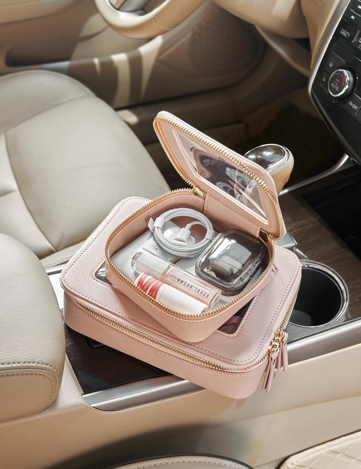 • [Mini but Mighty] – The pink mini makeup bag measures 5'' x 4.7'' x 2'' (12.7cm x 12cm x 5cm), perfect for holding daily mini essentials including lip balms, hair ties, jewelry, Air Pods, charging cords and medications. Slip it into your purse, backpack, everyday tote or travelling bag for easy access to your must-have items.