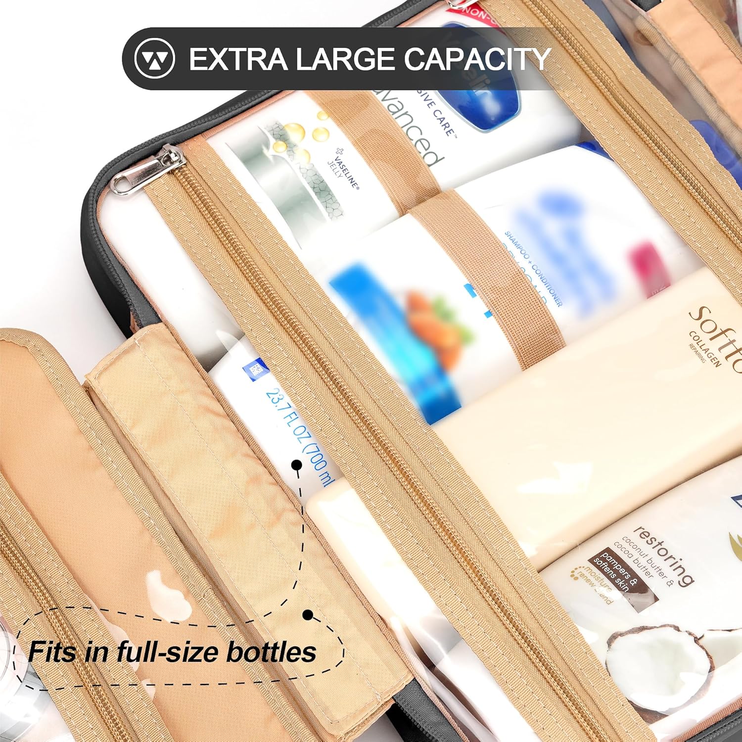 • PATENT PENDING GREAT ORGANIZER MASTER - This wash bag is designed with 4 toiletry storage compartments and a special jewelry compartment; you can easily put your wash products and jewelry separately to make your journey organized. The size of the fully-loaded state is 12.5''L x 10''H x 4.5''W, the 2 main compartments can hold up to 8 full-sized toiletries and cosmetics at the same time, no worries for long-distance travel.