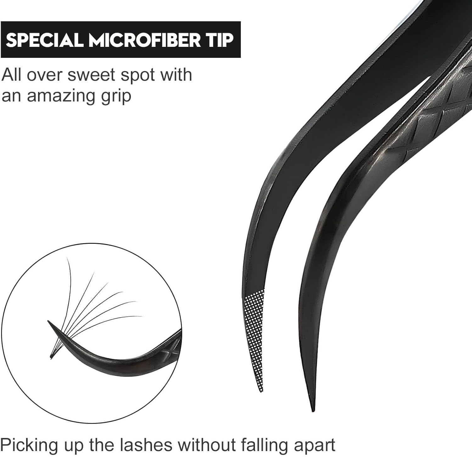 • ★FIBER TIP LASH TWEEZERS:Specifically designed with a microfiber tip Special microfiber tip—All over sweet spot with an amazing grip, picking up the lashes without falling apart.For professional lash artists use & beginner Friendly.