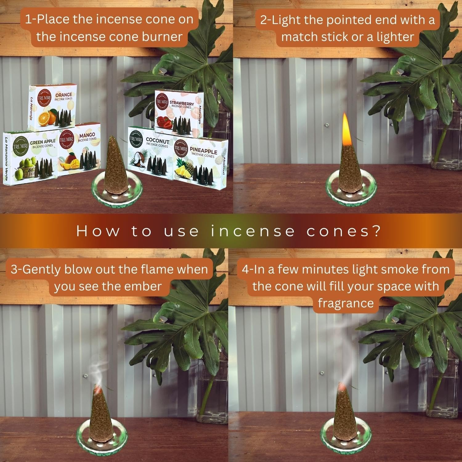 • Captivating Aromas - Immerse yourself in the delightful scents of our fruity incense cones, including Strawberry, Coconut, Pineapple, Apple, Mango, and Orange.