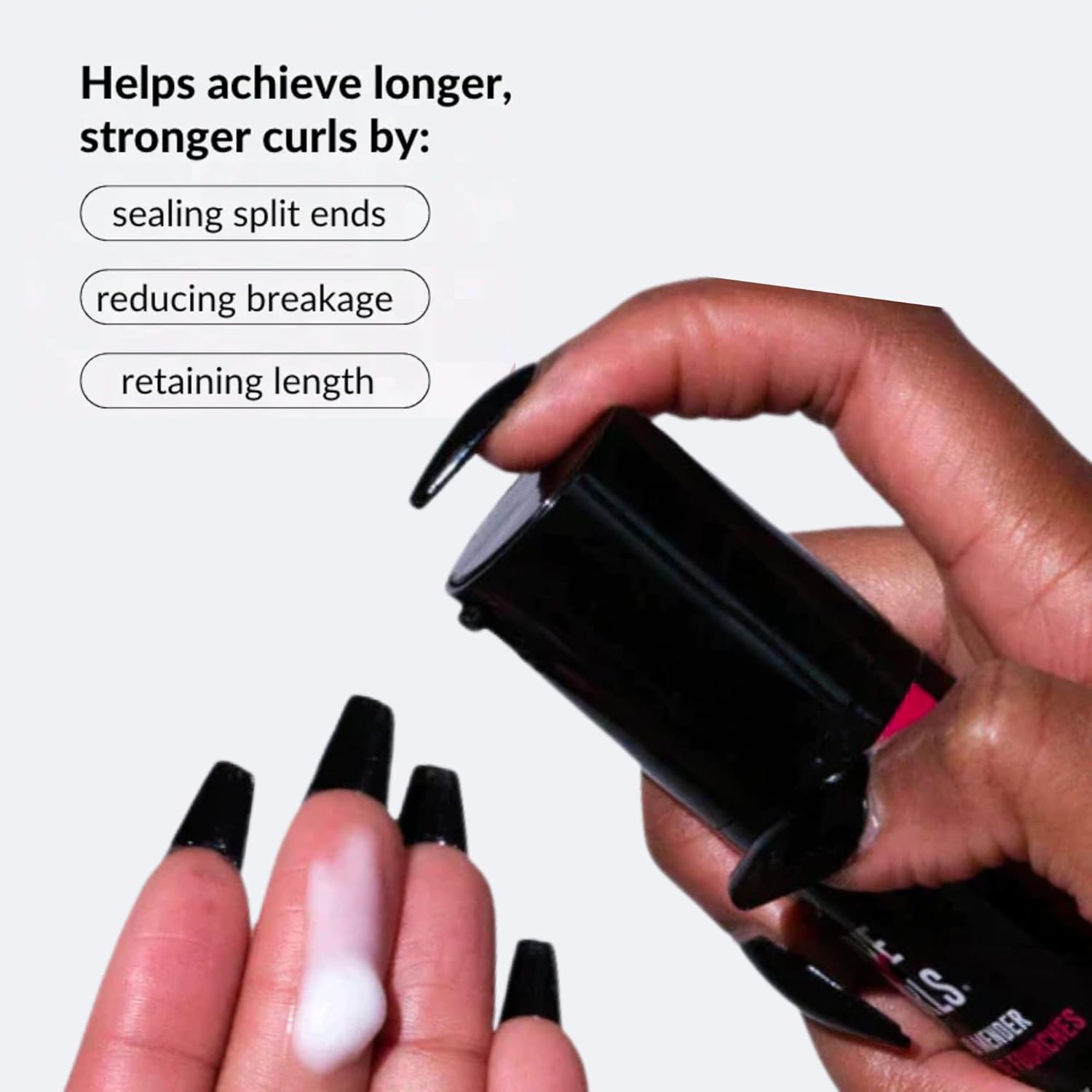 • Longer, Stronger Curls: By sealing split ends for up to 3-5 washes it minimizes the appearence of existing damage and prevents splits from travelling up the hair shaft. This not only extends the time between trims but also reduces the amount of damage that would typically get trimmed off.