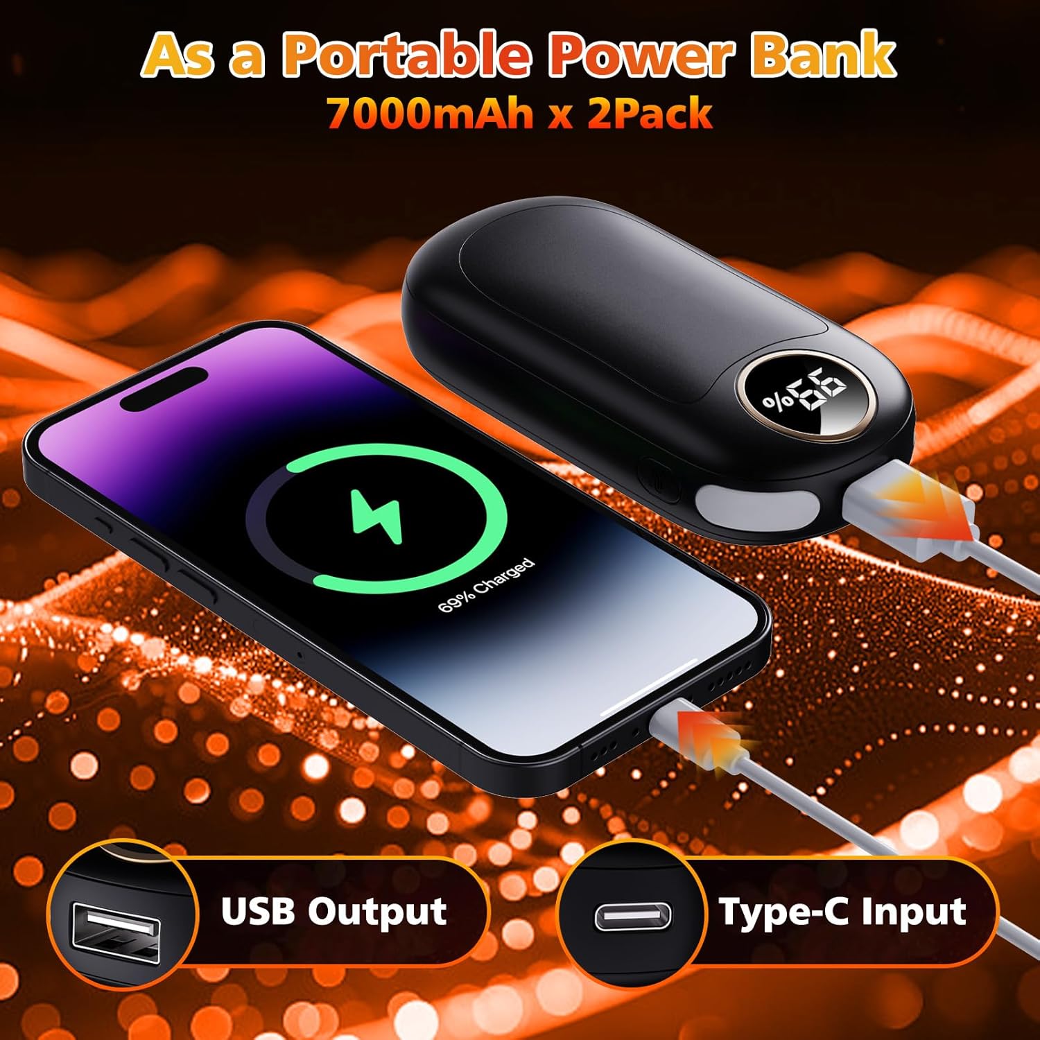 • 【Long Battery Life & Fast Charging】This rechargeable hand warmers total is 14000mAh (7000mAh * 2 Pack) . It can be fully charged in 3.5 hours and can provide up to 20 hours of continuous warmth! When you use single sided heating mode, it can be used up to 18 hours, and when you use double sided heating mode, it can be used up to 8 hours. These come with a Y-shaped charge cable allowing you to charge both using one charging port. Say goodbye to the hassle of frequent charging