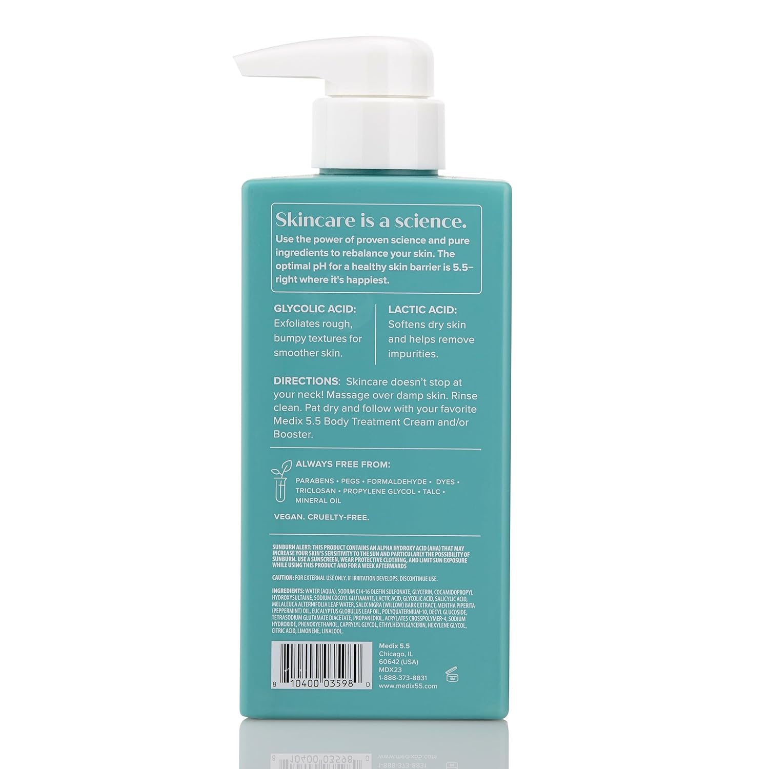 • SMOOTHING CLEANSE: Our glycolic acid body wash exfoliates and resurfaces rough and bumpy texture to reveal softer, smoother skin. The Alpha Hydroxy Acids within this exfoliating body wash prepares your skin for treatment body creams/lotions to effectively be applied by helping to remove the dry, dull skin that builds up on the surface of our skin. Dry skin can act like a shield that prevents active ingredients from penetrating.