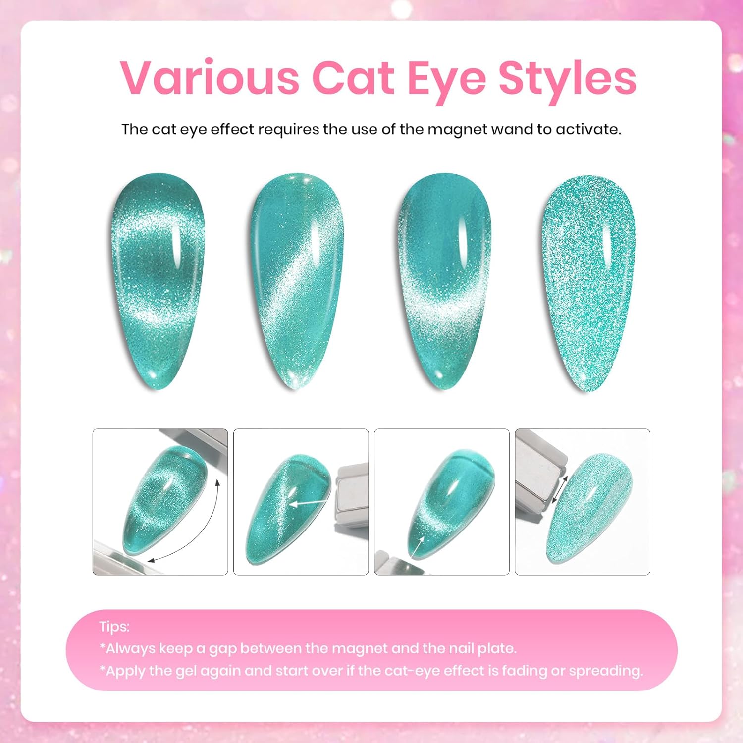 • 【Valentines Gel Nail Polish】6 Colors Holographic Glitter Cat Eye Gel Polish of 7.5ml /0.25fl.oz each and one magnet for various cat eye nail art designs. Professional Uv Led cured cat eye gel nail polish for infinite styles. Tips: Place the magnetic stick over the surface about 3-5mm for 5-10 secs to get your desired effect !!!!!