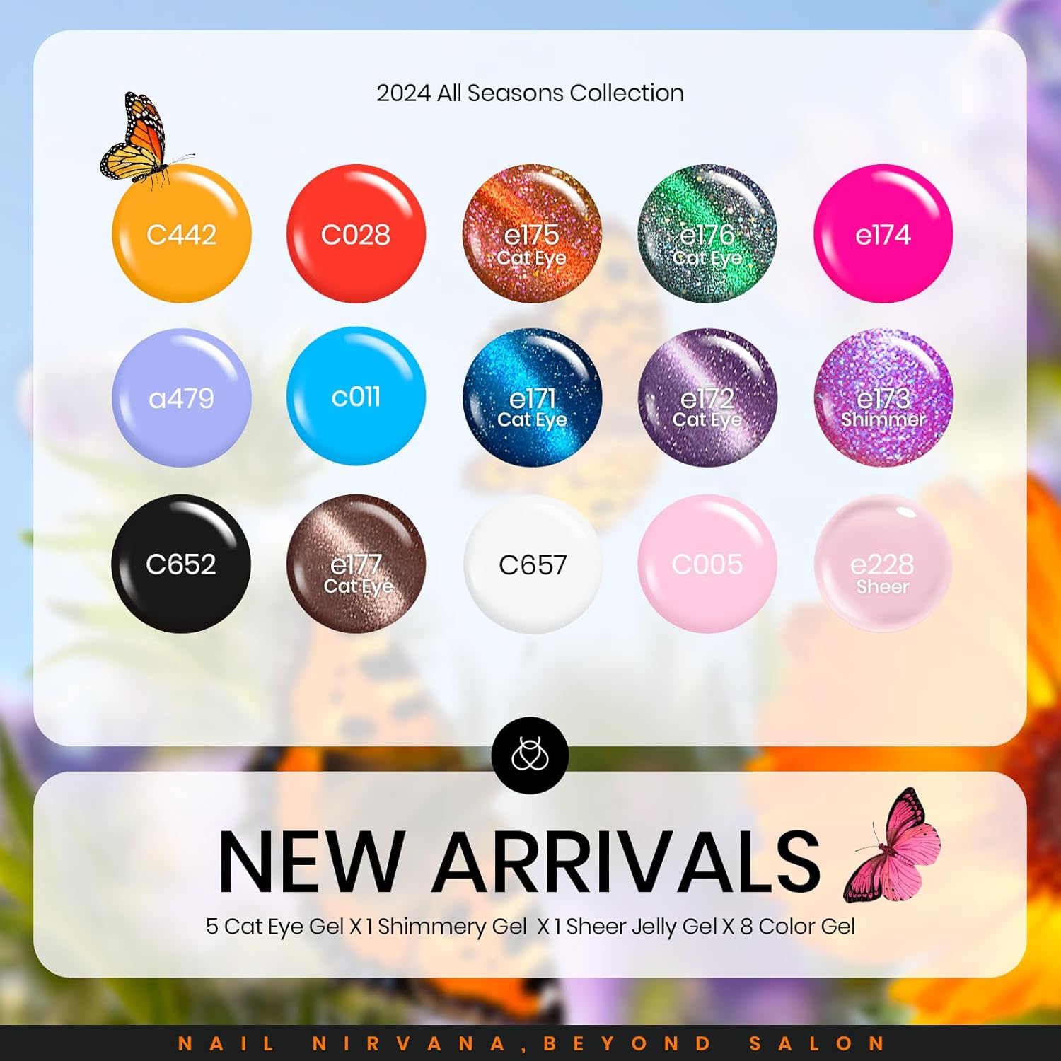 • 【What You Get】15 x Mini Gel Polish Colors (0.17oz/5ml each bottle) + 3 x No Wipe Base and Glossy & Matte Top Coat (0.25oz/7.5ml each bottle)+Color card*24 pcs+Medium Almond& Medium Coffin false nail tips*60 pcs+Double-headed magnet*1+Silicone mold kit*1+Tweezers*1+ Nail Art Jelly Strips*5+Paper card*1. 15 beautiful shades of popular and trendy colors suitable for all seasons and daily routine life! Color Numbers are: c442-c028-e175-e176-e174-a479-c011-e171-e172-e173-c652-e177-c657-c005-e228.