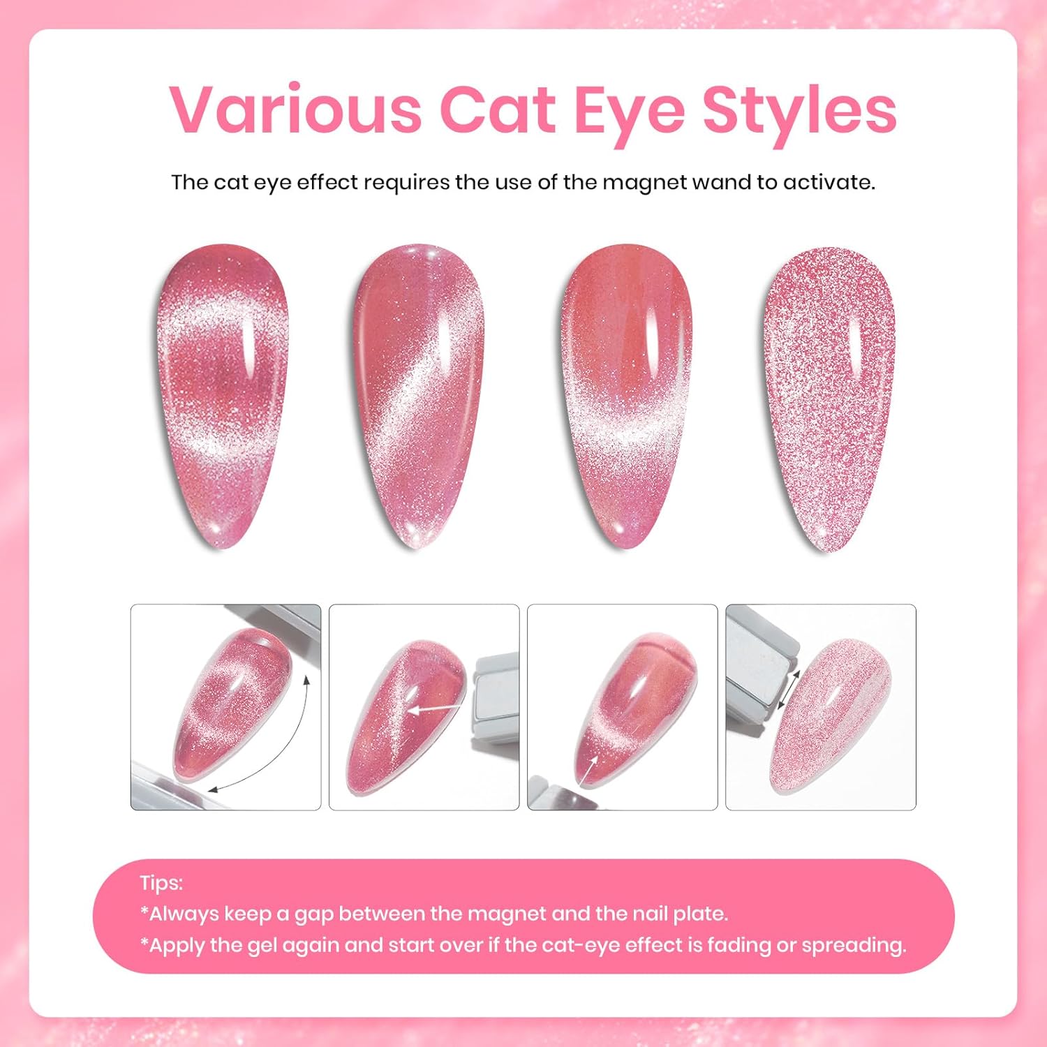 • 【Warm Tips】Please conduct a skin test before use with glitter pink cat eye gel nail polish. Professionally formulated and only used for nails. Place the magnetic stick over the surface about 3-5mm for 5-10 secs to get your desired effect! After repeatedly sucking the cat eye color gel without any effect, the magnetic powder will become ineffective. You can add a layer to suck the cat eye gel again
