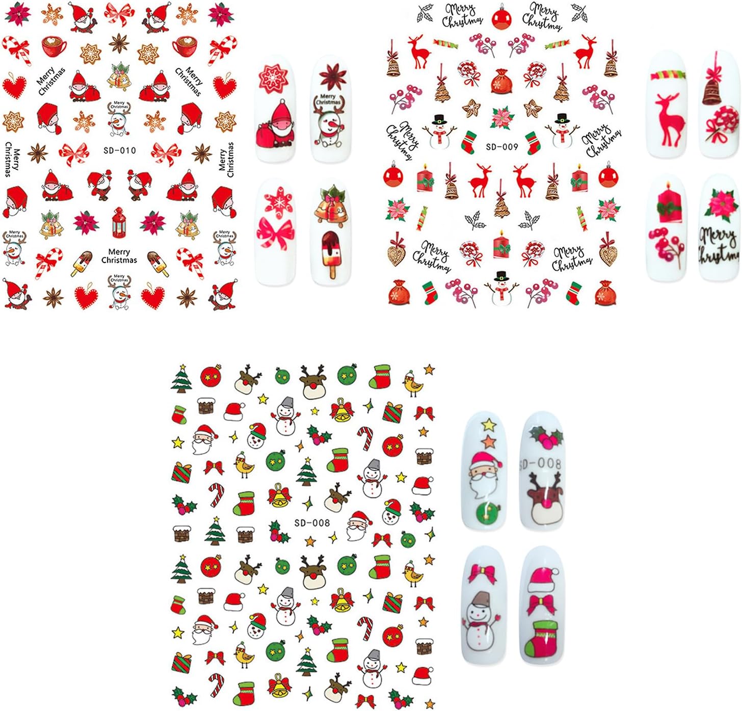 HNUIX Nail Stickers - 3D Christmas, Self Adhesive Nail Decals, Multi Colour, Snowman, Deer, Bells, 10 Sheets, for Nail Art
