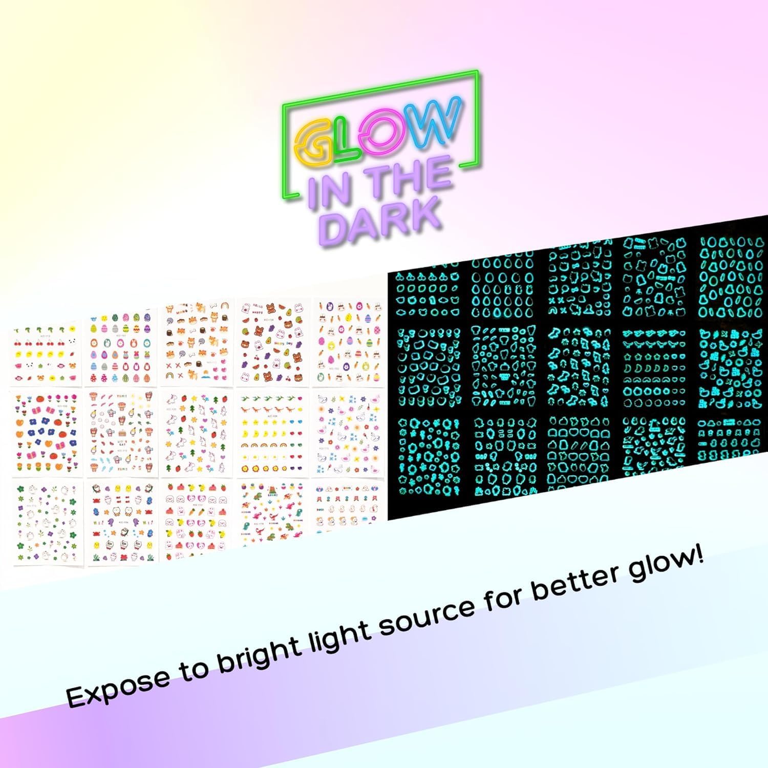 15 Sheets of Nail Stickers for Kids - 735 Cute Nail Stickers - Nail Decals for Girls - Flower, Bunny, Unicorn, Bear, Fruits | Glow in The Dark