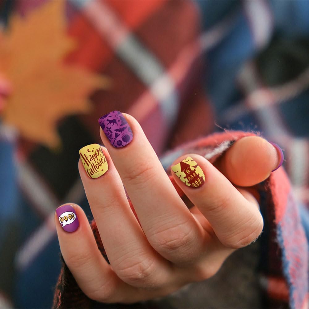 • Package Contains: 6 pieces Halloween nail stamping templates, including pumpkin, spider web, bat, ghost, skeleton, blood, fence, plaid background, witch, gnome, castle, cat and Halloween words, etc.. Each template contains a lot of sketches and offers you multiple choices to create proper style and make your nail more attractive. Notice: the stamp and scraper are not included.