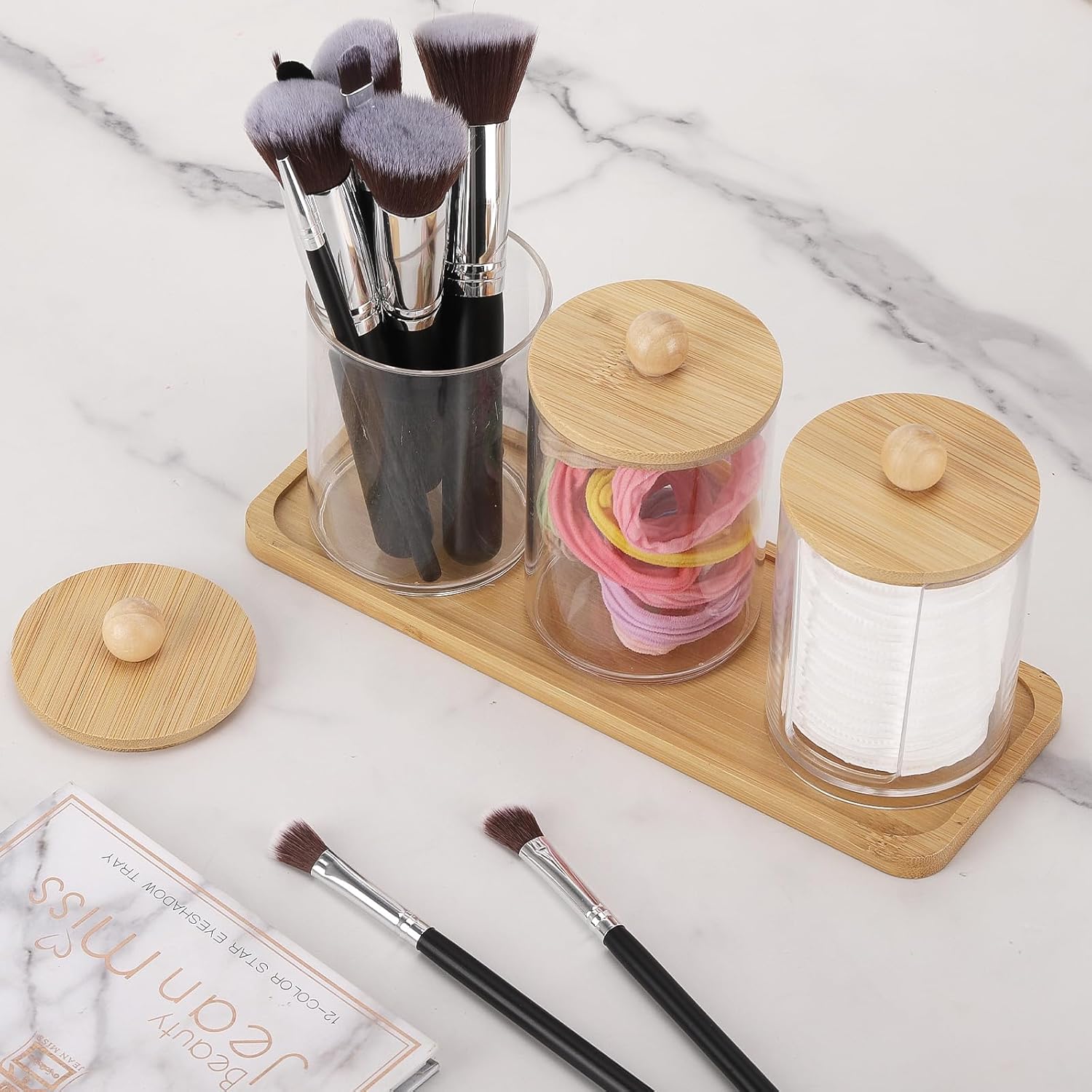 Tbestmax 10 oz Qtip Holder with Vanity Tray, 3 Pack Cotton Swab/Ball/Pad Dispenser Apothecary Jar, Clear Bathroom Containers Dispenser for Storage Bamboo Lids
