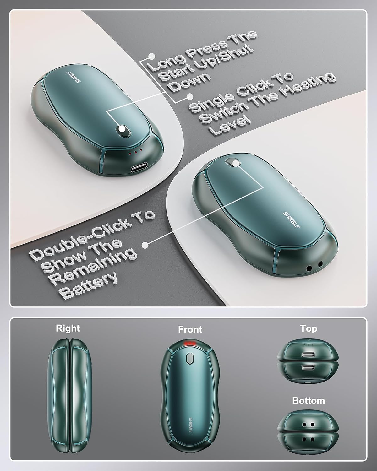 • 【Battery Level Alert】Double tap the on button at the top of the rechargeable heater to check the power level. When the handwarmer is low on power during use, the indicator lights on both sides of the on button will blink to indicate this. Remind to charge in time for next use.