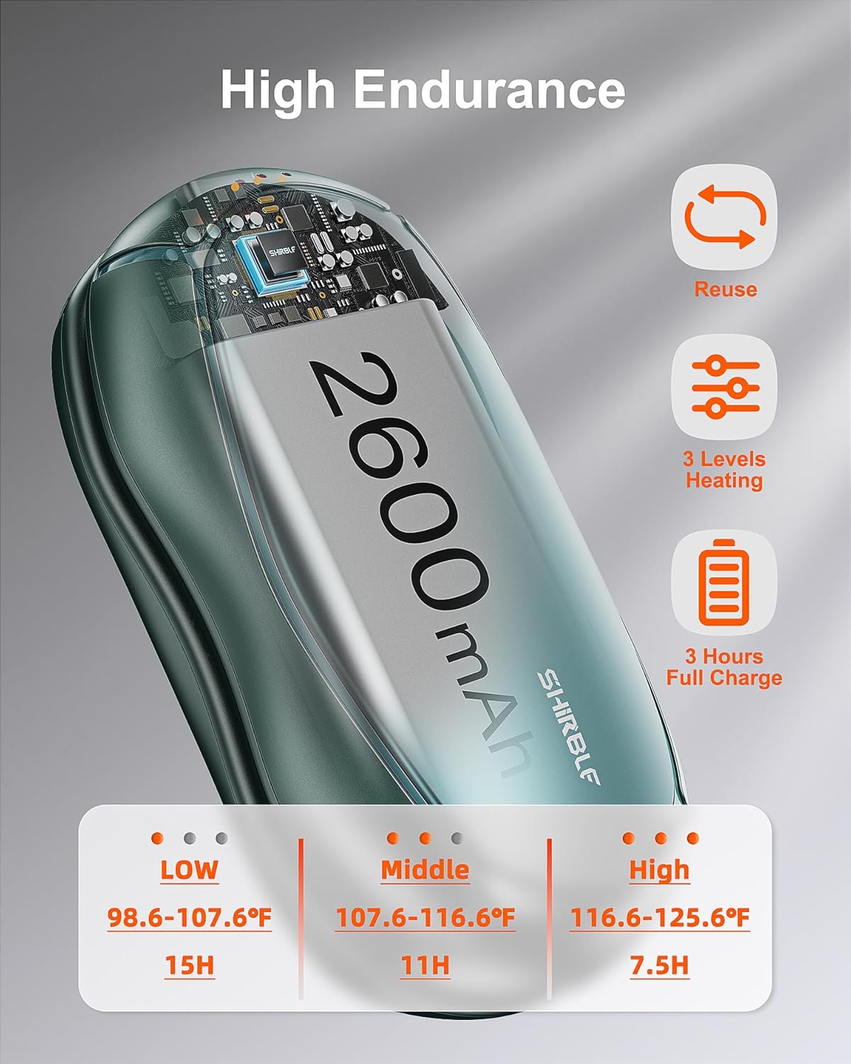 • 【Three Seconds Quick Heat】There is an on button on the top of the electric hand warmers rechargeable, press and hold for three seconds and the reusable hand warmer will turn on the heating to 105.8℉-114.8℉-125.6℉. Adjust the suitable temperature according to different temperature needs.