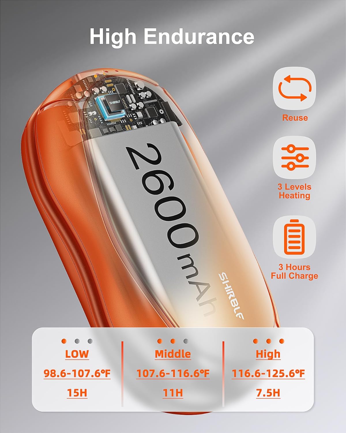 • 【Rechargeable & Three Levels of Temperature】Electric hand warmers, 5200mah rechargable hand warms with up to 12 hours battery life, USB hand warmer. With 3-speed indicator light, you can adjust three different temperatures, the use of time is 7-9.5-12 hours. Choose the right temperature for a comfortable using experience.