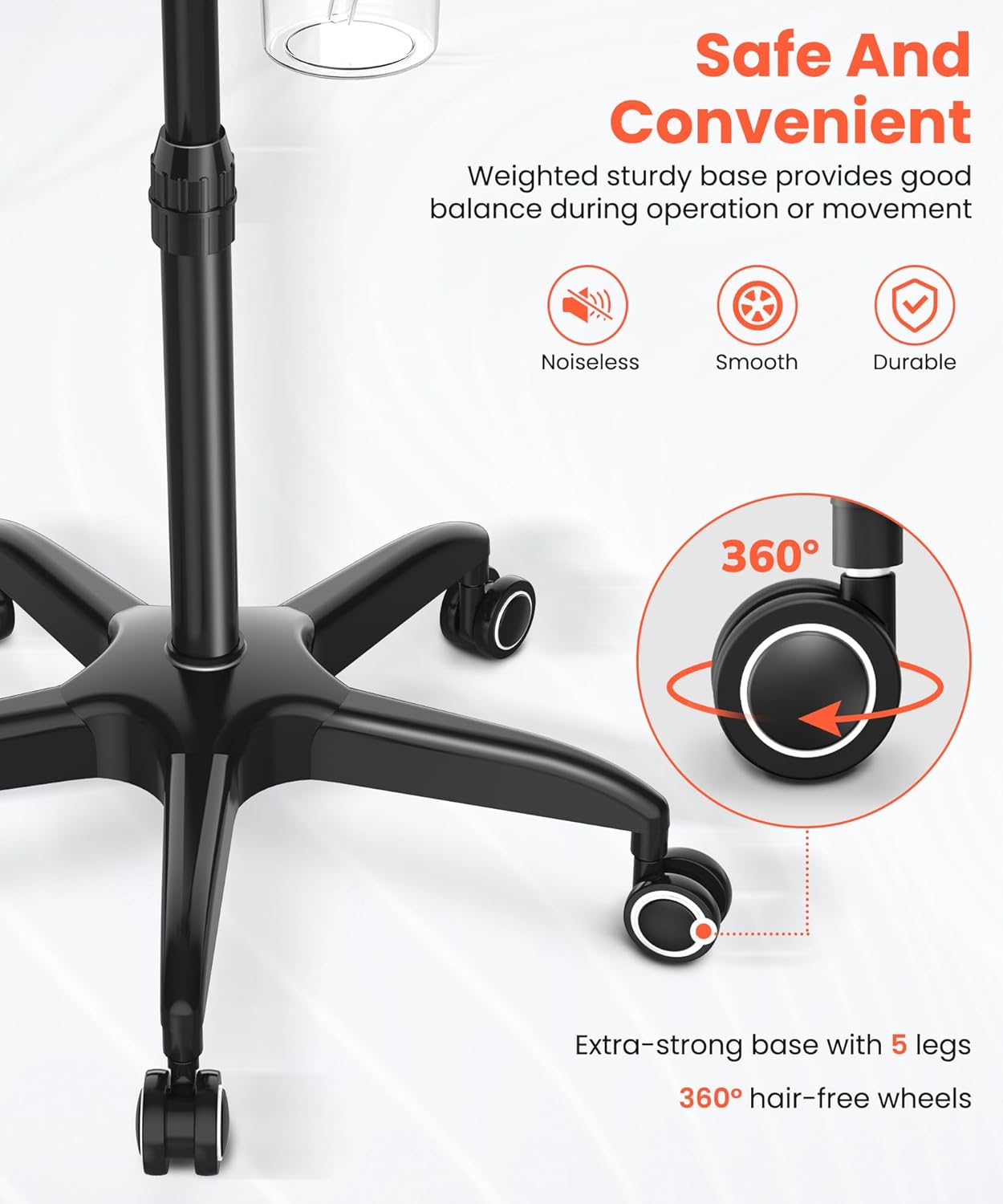 • Stability & Practicality: This facial steamer features a 4-leg wheel stand base for easy movement and stability during use. Ideal for salons, spas, or home, it delivers professional-quality treatments, ensuring a radiant and rejuvenated complexion every time