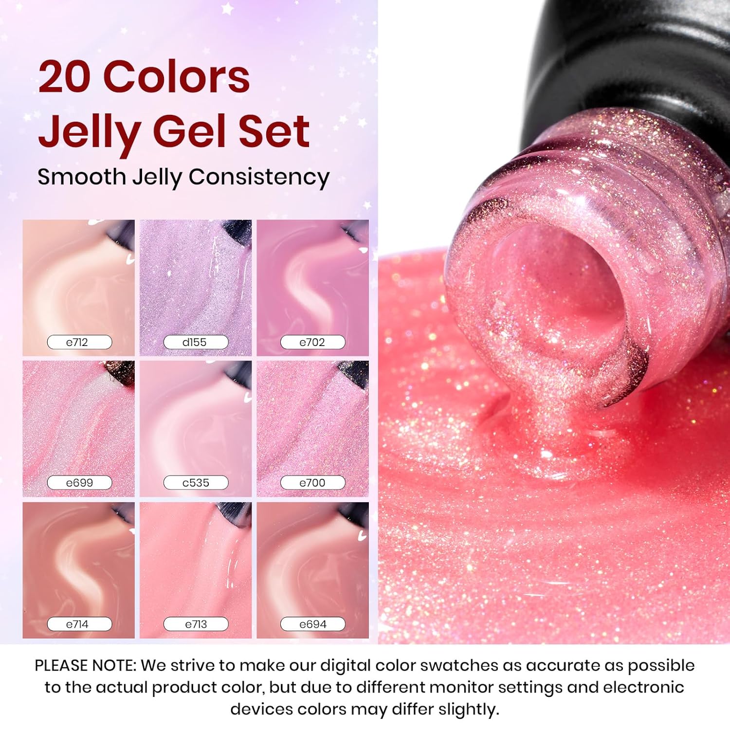 • 【Sheer Jelly Gel Styles】Apply several layers to build up the color from clear translucent to solid opaque. Each layer, whether one, two, or three layers, creates a different effect. The jelly gel and cat eye gel is UV gel and need to be cured 60-120s.