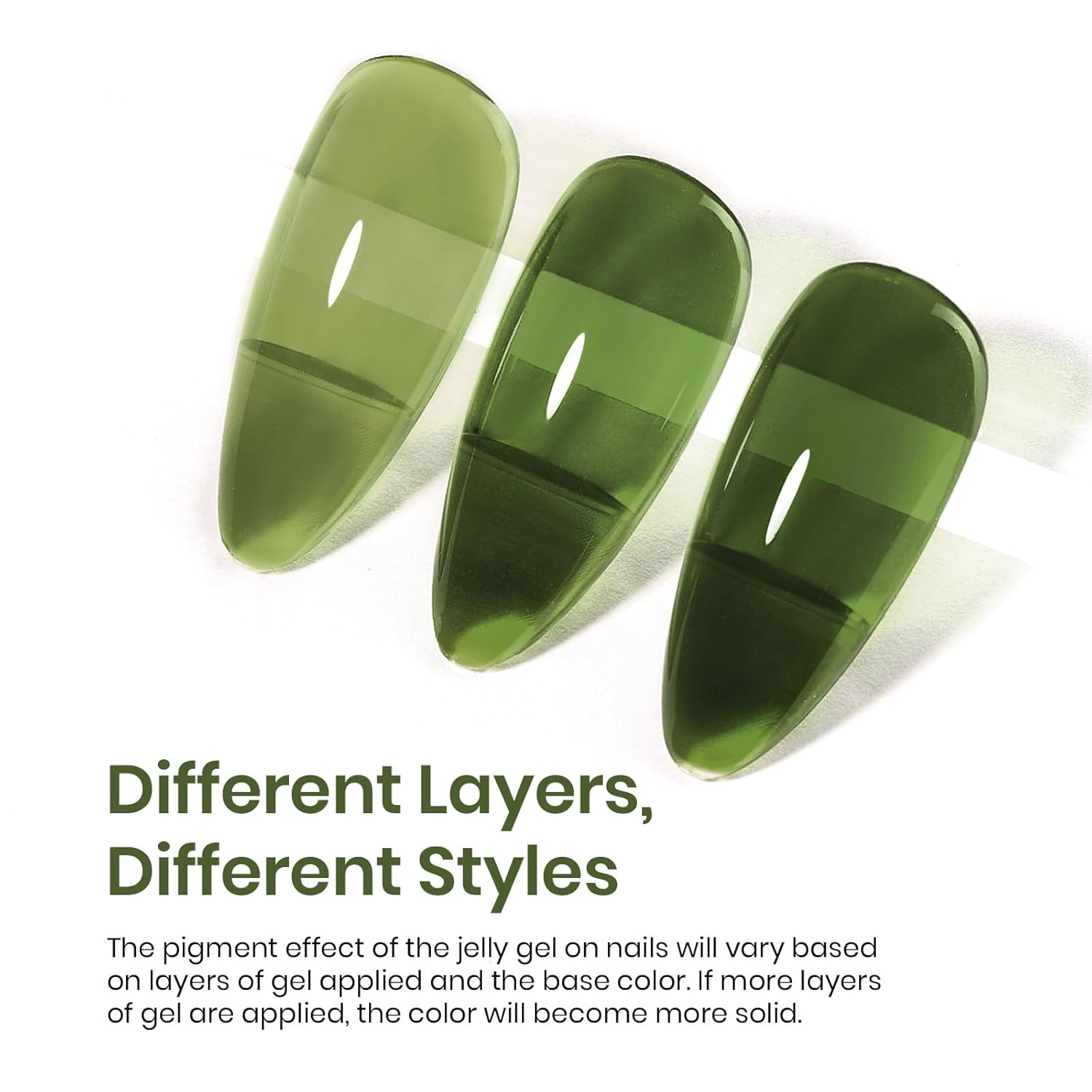 • Beetles Gel Polish: Sheer Green gel polish is essential for all season! (color number: e826) 1 Pcs 15ml/0.5oz jelly gel nail polish, each layers gives you different green styles. You'll be dizzy with delight wearing this sheer color gel.