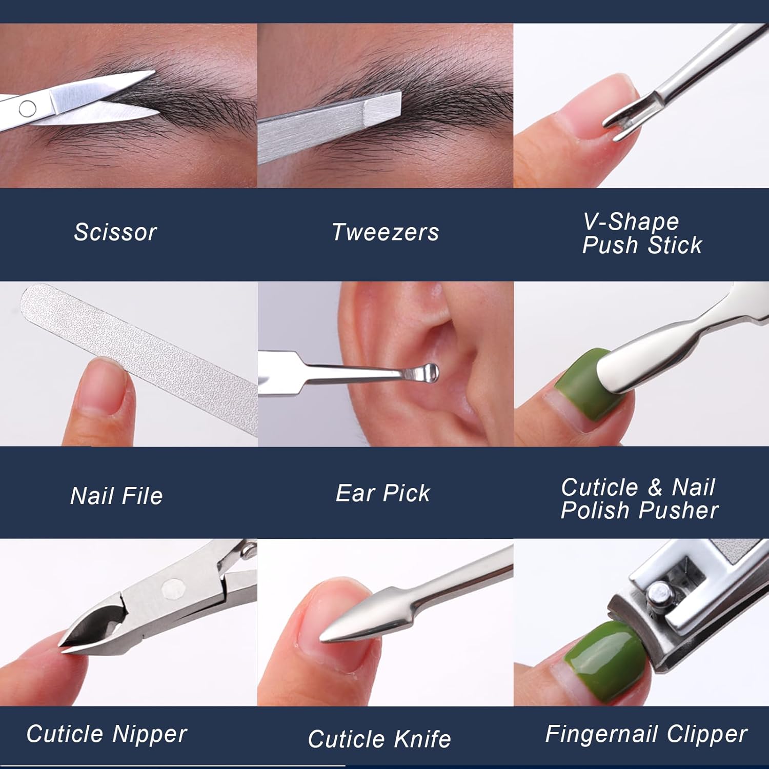 • 【FAMILIFE 11Pcs Manicure Kit】 FAMILIFE stainless steel manicure tools kit includes 11 tools, 1x Fingernail Clipper, 1x Toenail Clipper, 1x Cuticle Nipper, 1x Obtuse Push Broach, 1X Nail File, 1x Eyebrow Tweezers, 1x V-Shape Push Stick, 1x Ingrown Toenail Clipper, 1xBeauty Scissors, 1xCuticle Knife, 1xEar Pick, equipped with mens manicure pedicure set care tools for hands, feet, and face. And a portable blue leather case is included which is easy for you to travel.