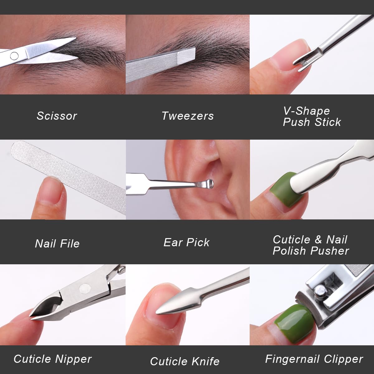• 【FAMILIFE 11Pcs Manicure Kit】 FAMILIFE stainless steel manicure tools kit concludes 11 tools, 1x Fingernail Clipper, 1x Toenail Clipper, 1x Cuticle Nipper, 1x Obtuse Push Broach, 1X Nail File, 1x Eyebrow Tweezers, 1x V-Shape Push Stick, 1x Ingrown Toenail Clipper, 1xBeauty Scissors, 1xCuticle Knife, 1xEar Pick, equipped with mens manicure pedicure set care tools for hands, feet, and face. And a portable black leather case is included which is easy for you to take out.
