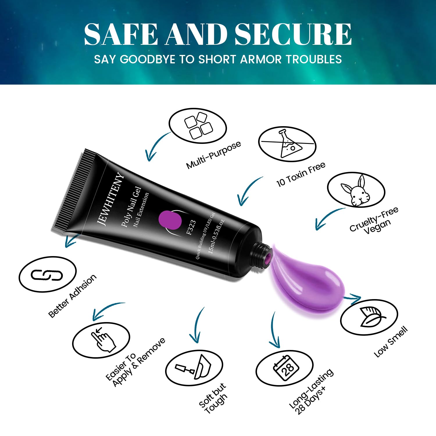 • 【HEALTHY,NATURAL,FLEXIBLE】:JEWHITENY poly gel made with non-toxic ingredients keeping your nails healthy with a low odor formula!superior to other nail extension products, and fits your nails seamlessly.The new upgraded formula makes your lengthened nails as flexible, strong and lightweight as natural growing nails.Double the beauty, but without the extra burden.