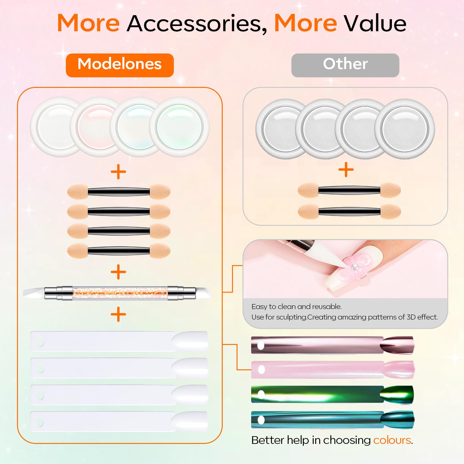• 【What You Get】 Modelones 4 Jars chrome nail powder kit includes 4 different colors that cover all daily chrome nail design needs, 1*silicon nail brush, 4* applicator brushes, and 4*nail swatch sticks. 1 chrome powder for gel nails kit can do more than 100 nails at home DIY or in salon use.