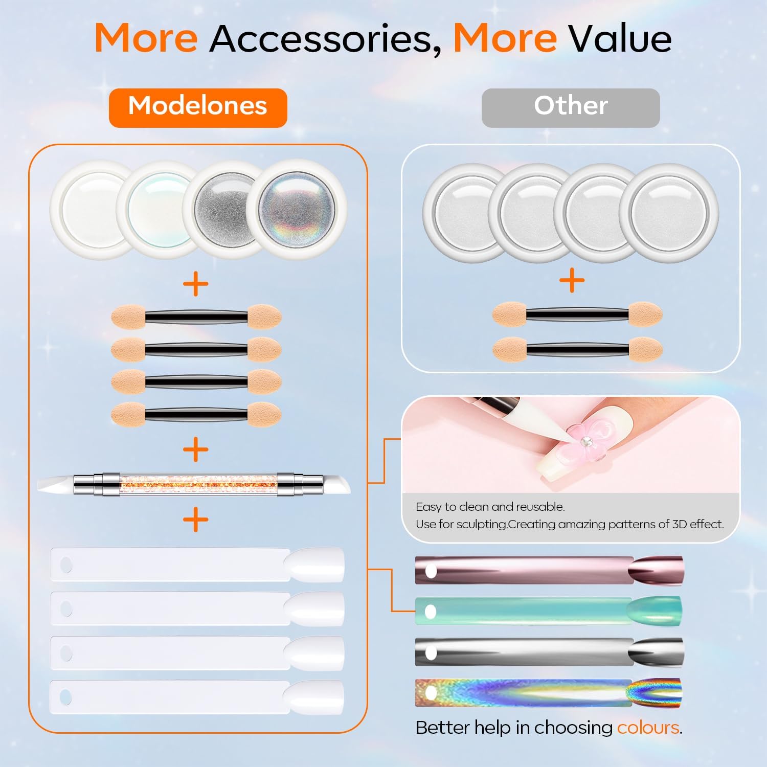 • Package Contents: 4 Jars Nail Chrome Powder (Laser Silver,holographic glitter powder,magic white chrome nail powder, Pearlescent Green). 1pc silicon nail brush, 4 pcs eyeshadow sticks and 4 swatch sticks