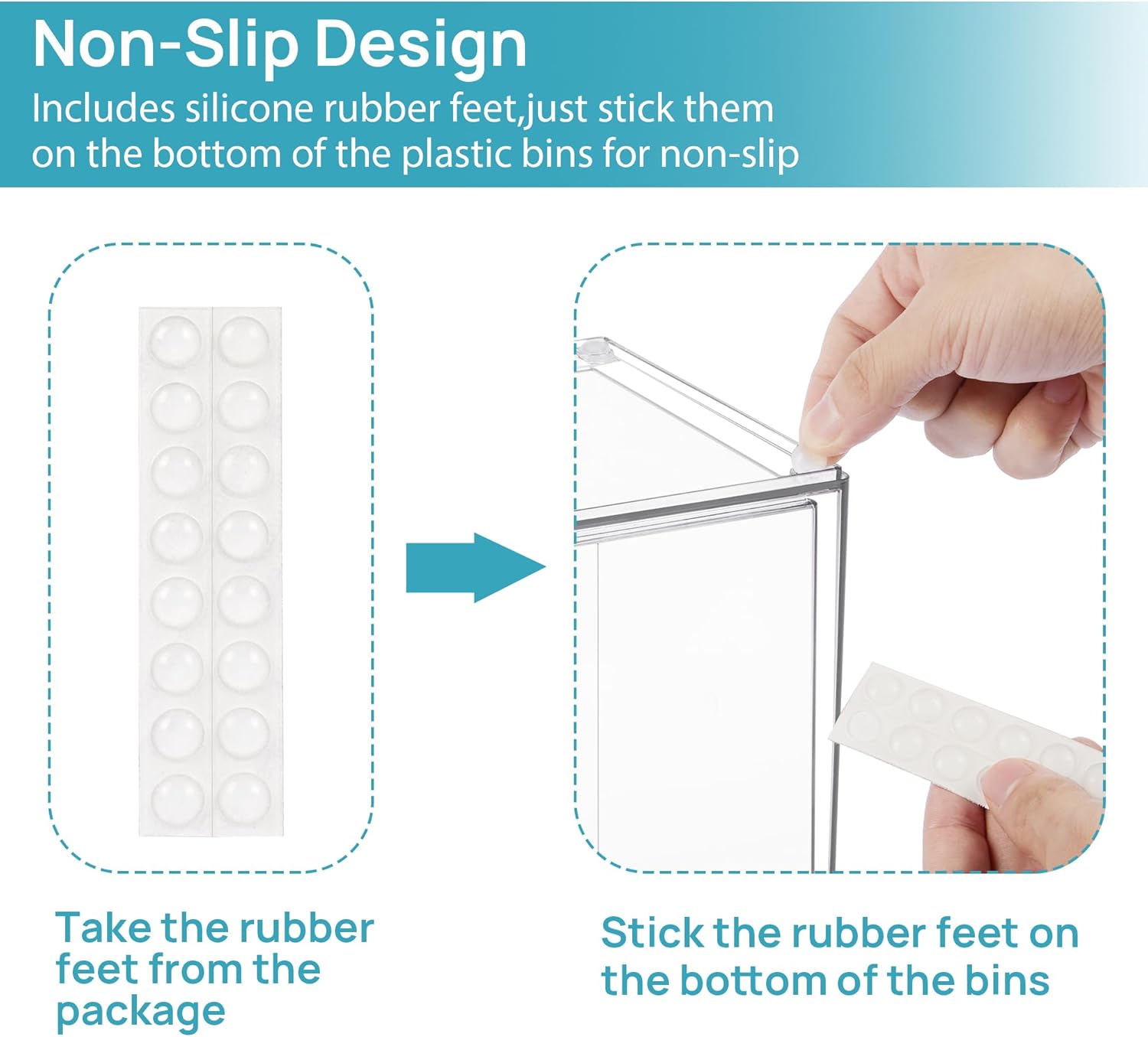 • [Built-in Handle and Non-Slip] Clear organizing containers are designed with pull-out handles, it is convenient to store and take out items.Extra silicone pads are included, add the rubber sticker dots to the bottom,our storage drawers slides in and out very effortlessly and outer frame don't move when pulled out the drawers.