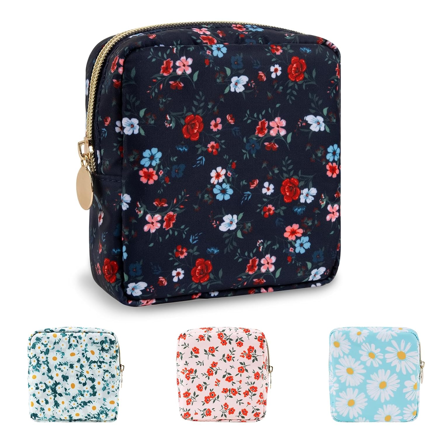 Waterproof Mini Floral Makeup Bag Pouch for Purse,Nylon Flower Cosmetic Travel Bag Small Preppy Toiletry Organizers Bag for Women Girl,Cute Zipper Pouch Coin Purse for Work(Mini Black-Flowers)