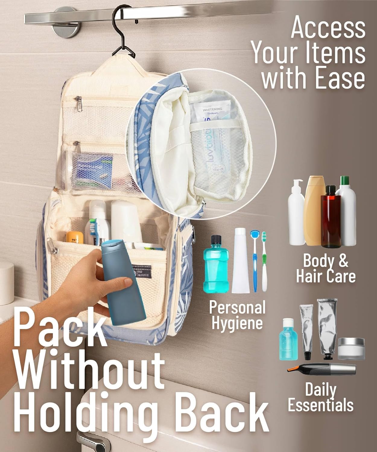 • Convenient Hanging Hook: The XXL metal swivel hook allows you to hang the bag anywhere, saving valuable counter space. It's perfect for use in hotels, bathrooms, or even on a camping trip.