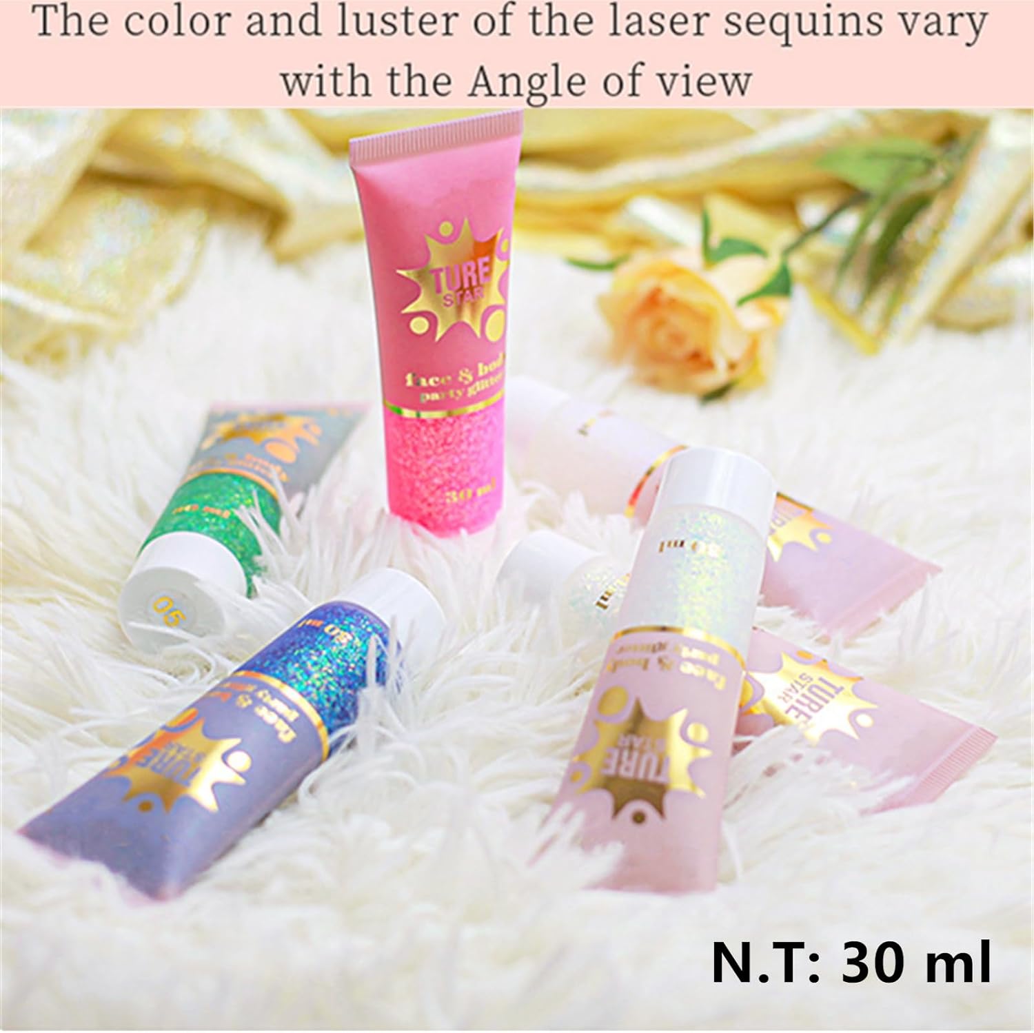 • 【Easy to Apply,Easy to Clean】Has a stick adhesive,goes on smoothly with a quick swipe of a finger or brush after easy squeezing out.Can be applied over face paint designs or body shimmer without smearing them.For ultimate glitter effect apply in layers letting each layer dry before applying the next.Easily remove with soap and water.