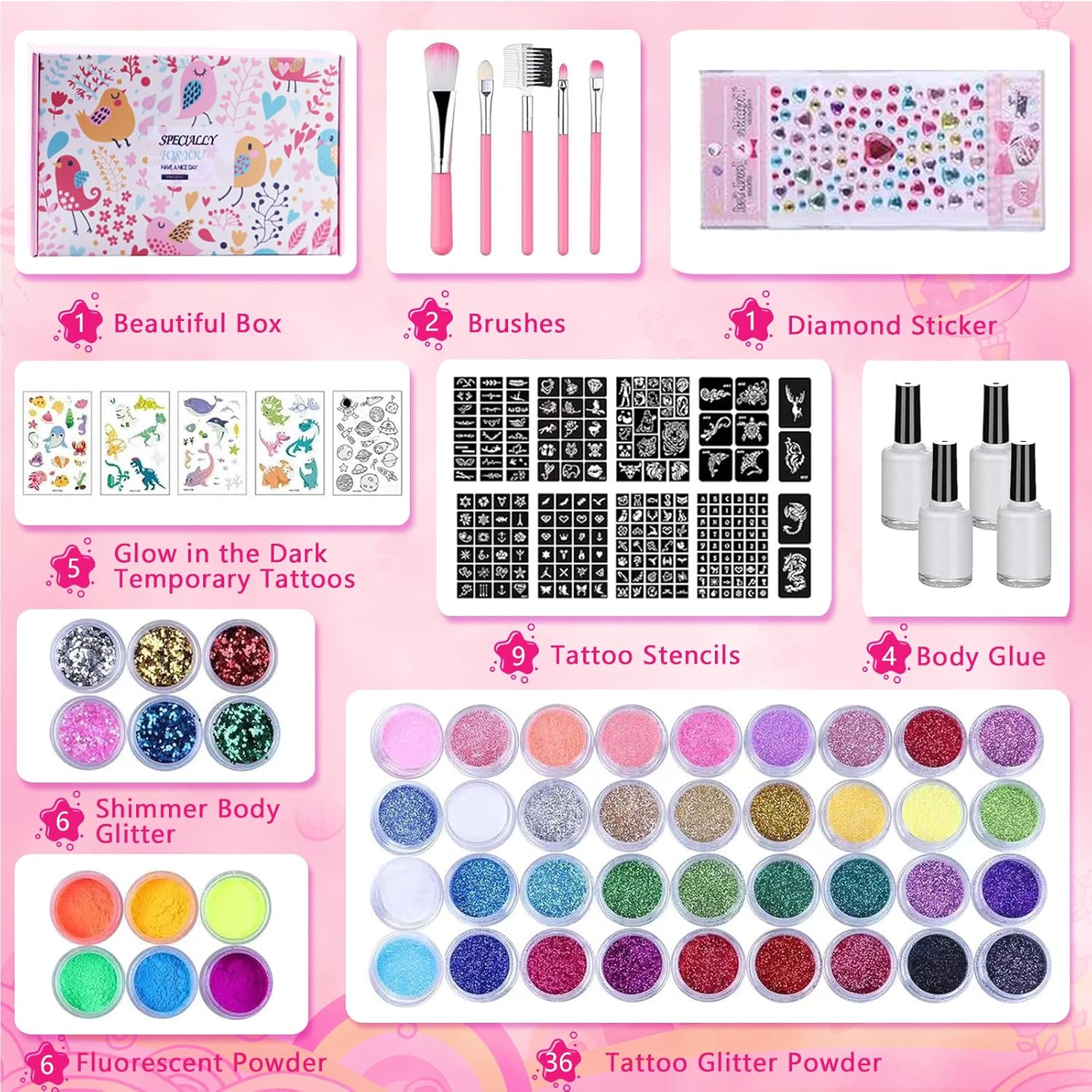• Complete Temporary Glitter Tattoos Kit: This glitter tattoos kit contains 36 vibrant colors, 6 fluorescent colors, 6 shimmer colors glitter powder, 4 glues, 5 brushes, 209 unique stencils, 1 sheet diamond sticker, and 5 luminous tattoo stickers. Its prepared everything necessary for you to design and customize your desired favourite glitter tattoos, perfect for kids and adults for endless creativity and fun!