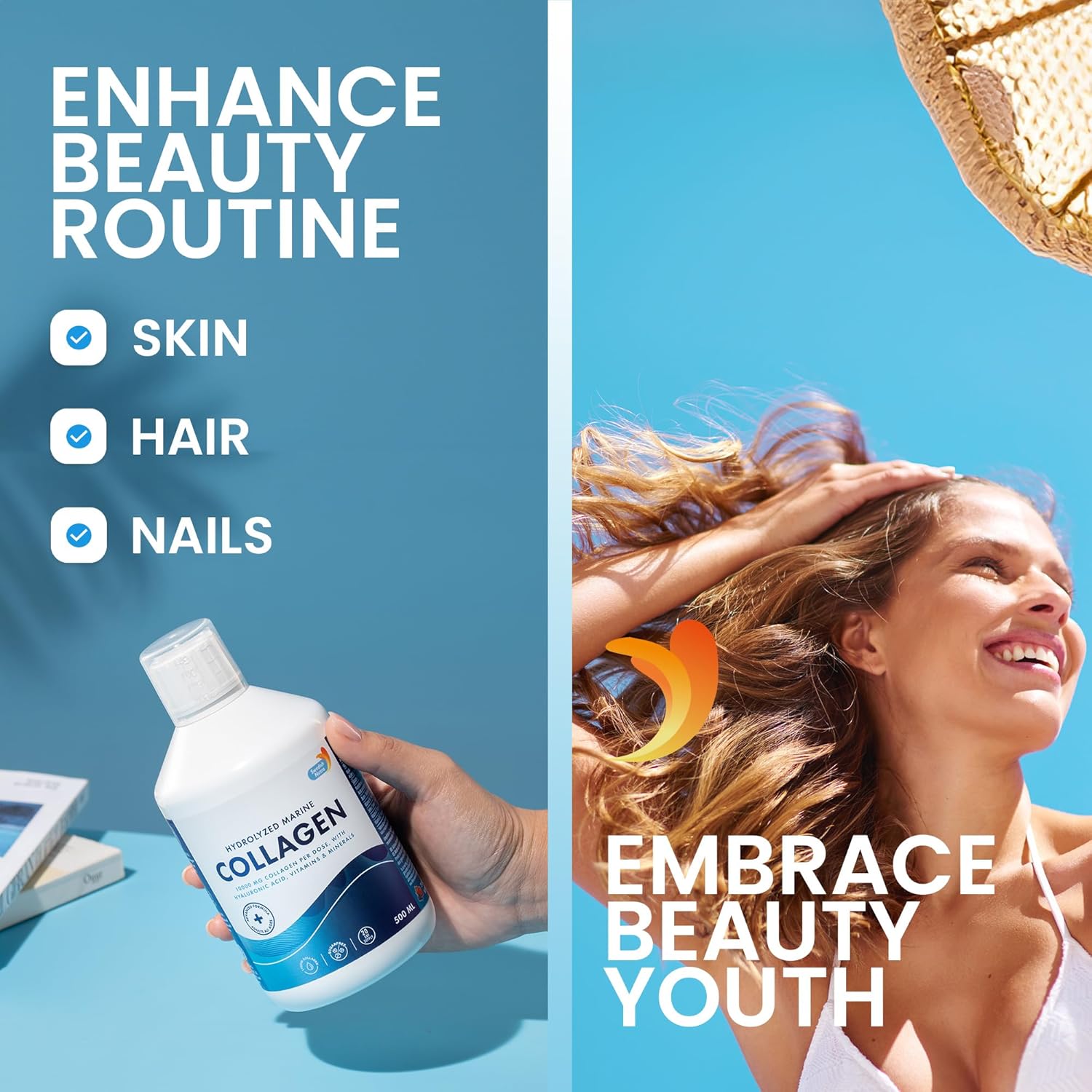 Swedish Nutra - 10,000 mg Hydrolyzed Marine Collagen Liquid Supplement - 500 ml, 20 Day Supply | Hyaluronic Acid, Biotin and Vitamin C to Support Healthy Hair, Skin, Nails and Joints | Sugar-Free