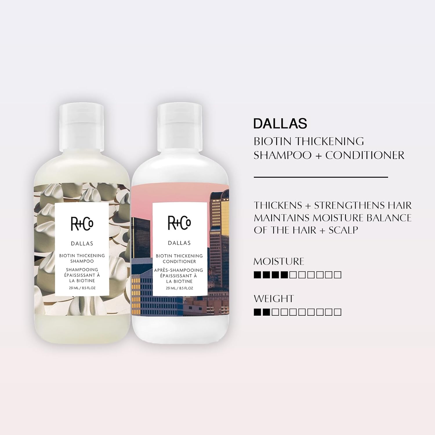 • R+Co Dallas Conditioner: The final step for hair as big as Texas. DALLAS Biotin Thickening Conditioner revitalizes hair with lightweight hydration. Infused with Biotin for prolonged strength and enhanced shine.