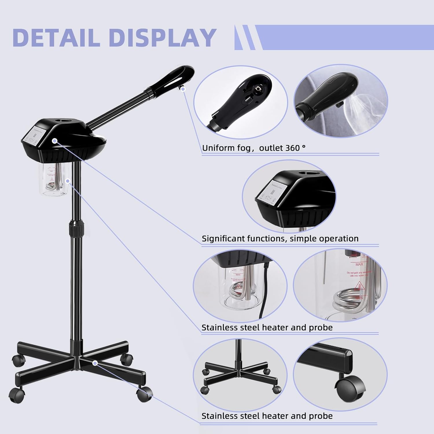 • 【Facial Steamer Professional】This facial steamer has an upgraded atomizing cartridge, 360°rotatable nozzle, adjustable height from 36-51 Inches, 360°rotatable and smooth wheels. Suit your different needs.