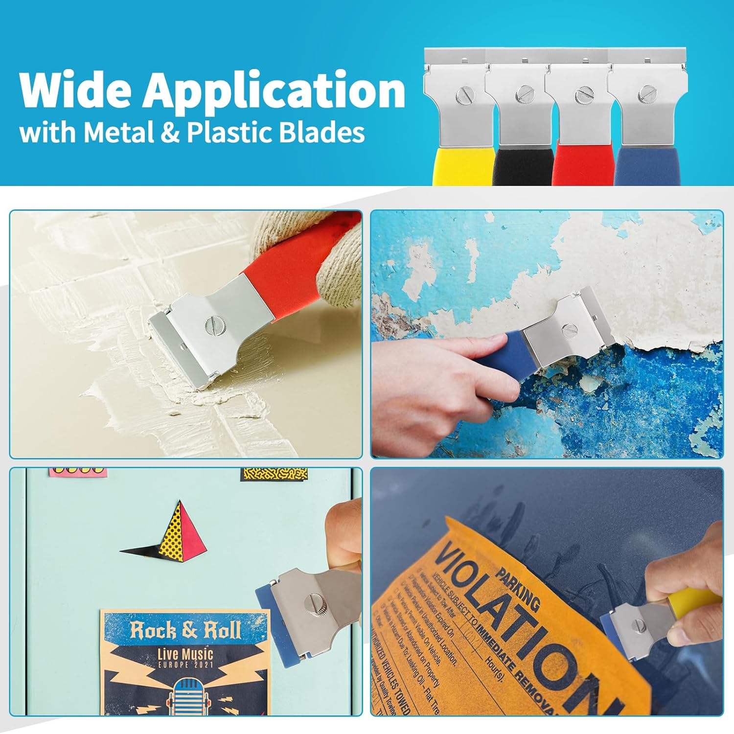• PREMIUM MATERIAL: Crafted for comfort and control, the scraper features a non-slip rubber handle, ensuring a comfortable grip. The body is made from high-strength steel alloy, while the metal blades are crafted from high-carbon steel and the plastic blades from premium injection-molded material. Sturdy, they are built to withstand use without deformation or breakage.